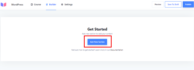 Selanjutnya, Anda akan dibawa ke halaman Pembuat Kursus . Dari sini, Anda dapat menambahkan pelajaran serta kuis ke kursus Anda. Cukup, klik tombol Tambahkan Bagian Baru .