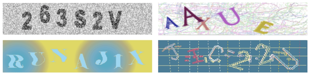 Versi pertama CAPTCHA menggunakan huruf dengan kerning, kemiringan, dan trik lain yang berbeda untuk mempersulit komputer membaca. Untuk lulus ujian, Anda harus mengetikkan teks miring dengan akurasi 100 persen ke dalam kotak yang tersedia.