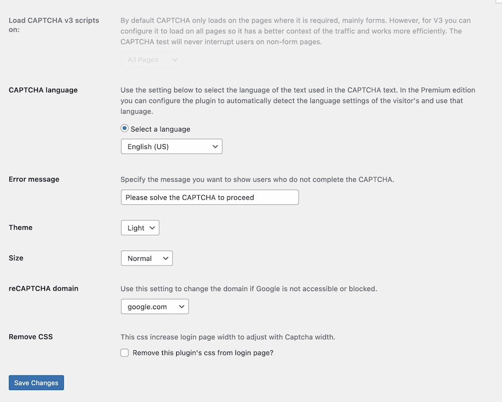 Misalnya, saat menggunakan versi 3, ini memungkinkan Anda mengubah sensitivitas pemeriksaan CAPTCHA dengan menetapkan ambang skor. Ada beberapa opsi bermanfaat lainnya di sini juga. Misalnya, Anda dapat mengatur tema, ukuran, dan pesan kesalahan khusus untuk CAPTCHA Anda. Namun, semua ini tidak akan membantu jika pengguna tidak dapat mengakses CAPTCHA itu sendiri.