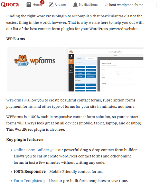 Coba jawab pertanyaan di forum populer atau di tempat-tempat seperti LinkedIn. Tinggalkan tautan ke halaman arahan situs Anda (bukan beranda Anda) yang memiliki formulir pendaftaran buletin WPForms. Dan, buat orang berlangganan untuk mengetahui lebih lanjut tentang topik yang dijawab di forum.