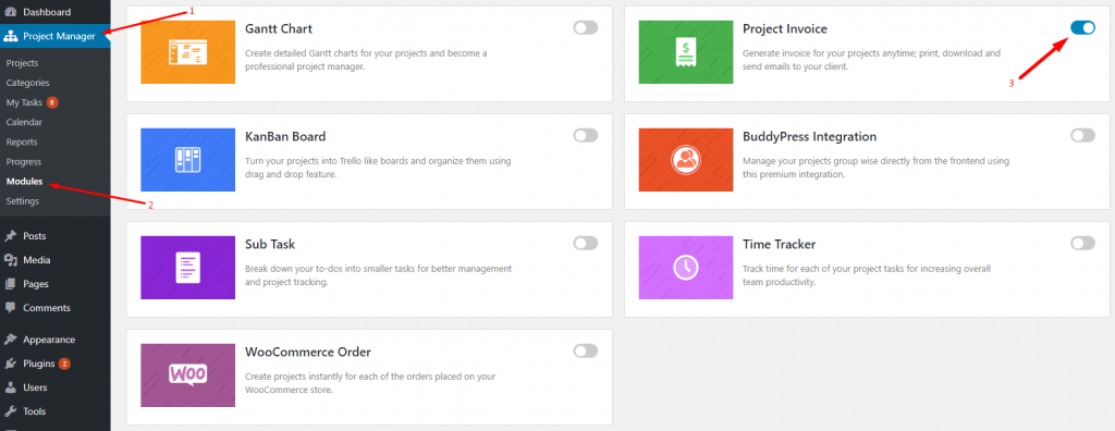 Pada awalnya, navigasikan ke WP Admin Dashboard → Project Manager → Modules. Kemudian, aktifkan modul “Project Faktur” dengan mengklik tombol sakelar seperti yang ditunjukkan pada gambar di bawah ini: