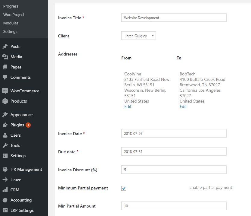 Tak perlu dikatakan, setiap bisnis membutuhkan sistem faktur untuk menyimpan catatan semua uang masuk dan keluar. Modul faktur memungkinkan Anda membuat dan memberikan faktur dengan mudah kepada klien Anda untuk suatu proyek. Juga, izinkan Anda untuk mengumpulkan pembayaran dan memperbarui faktur langsung dari dasbor WordPress Anda.