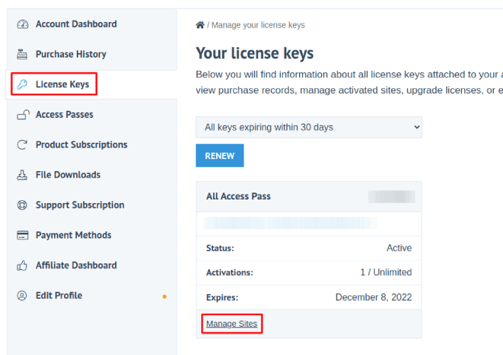 Lalu, buka dasbor Easy Digital Downloads dan buka Kunci Lisensi, lalu klik Kelola Situs :