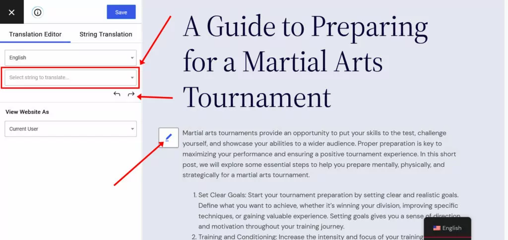 Ini akan membuka kotak teks baru di sebelah kiri tempat Anda dapat menambahkan terjemahan. Setelah selesai, cukup simpan dan mulai sekarang teks terjemahan akan muncul di situs web Anda.