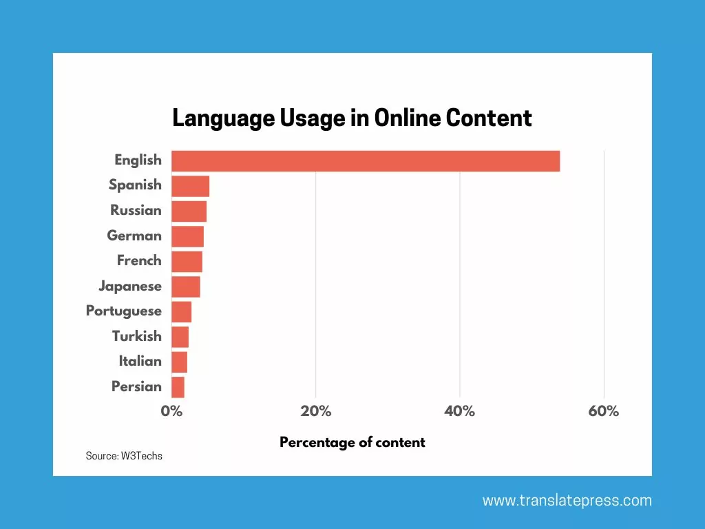 Salah satunya karena, seperti yang akan kita lihat di bawah, ada beberapa bahasa yang bahkan belum kita bahas. Selain itu, hanya karena banyak orang berbicara bahasa tertentu, bukan berarti masuk akal untuk menawarkannya di situs web Anda. Terakhir, distribusi bahasa di Internet tidak sama dengan di dunia nyata. Faktanya, ini sangat berbeda. Lihat pembagian bahasa dalam konten online menurut W3Techs di bawah ini.