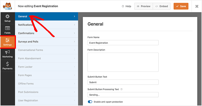 WPForms memberi Anda kendali penuh atas konfigurasi formulir Anda. Anda akan menemukan opsi ini di bawah tab Pengaturan dari menu navigasi kiri.