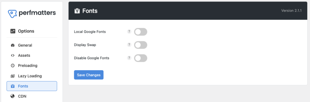Pengaturan font dari Perfmatters memungkinkan Anda menghosting font Google secara lokal, menampilkan pertukaran dan menonaktifkan atau mengaktifkan font Google dari situs web Anda. Anda bebas memutuskan opsi mana yang harus Anda aktifkan, tetapi berikut adalah saran saya: