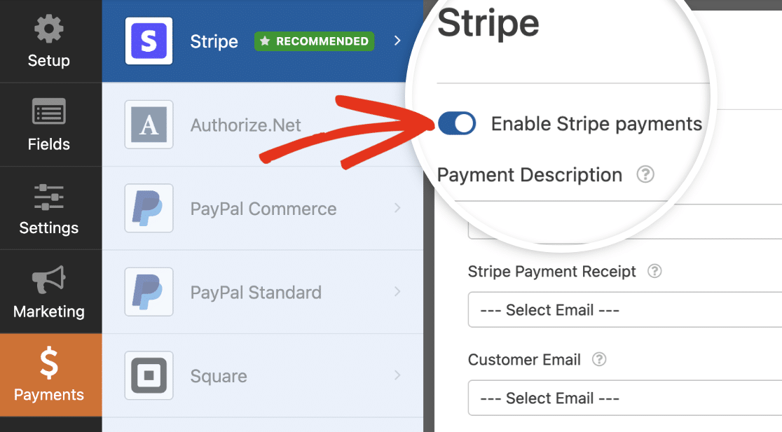Setelah formulir donasi Anda siap dengan semua bidang yang Anda inginkan, buka Pembayaran »Stripe . Kemudian dari panel Stripe, alihkan opsi berlabel Aktifkan pembayaran Stripe .