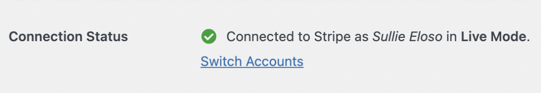 Status Koneksi seharusnya memiliki tanda centang hijau yang mengonfirmasi koneksi aman dan Anda sekarang dapat menerima pembayaran dengan Stripe.