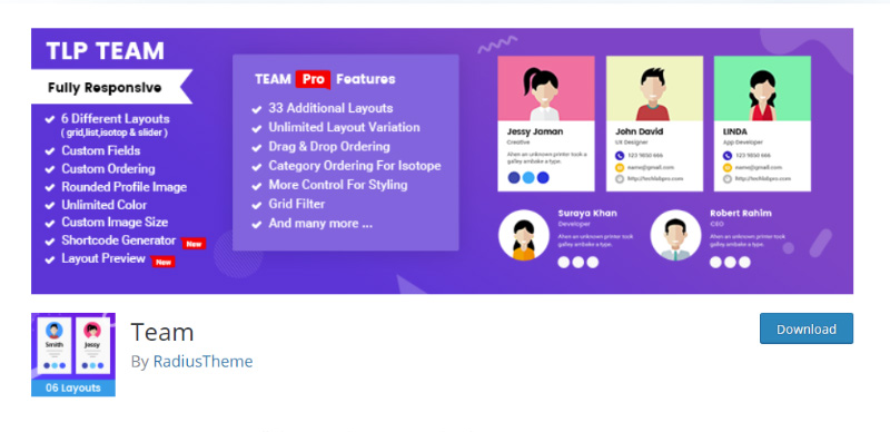 Seperti plugin WordPress tim lainnya, yang telah kami sebutkan sebelumnya, The Team Pro hadir dengan fitur serbaguna untuk memperkenalkan anggota tim dengan cara terbaik. Dilengkapi dengan 8 tata letak desain dan banyak pilihan gaya , alat ini memberi Anda kebebasan untuk menyesuaikan bidang anggota tim Anda seperti seorang profesional sejati. Cukup instal plugin dan mulailah membangun bidang tim dengan pola warna dan elemen desain yang dapat menampilkan tim Anda dengan gaya.