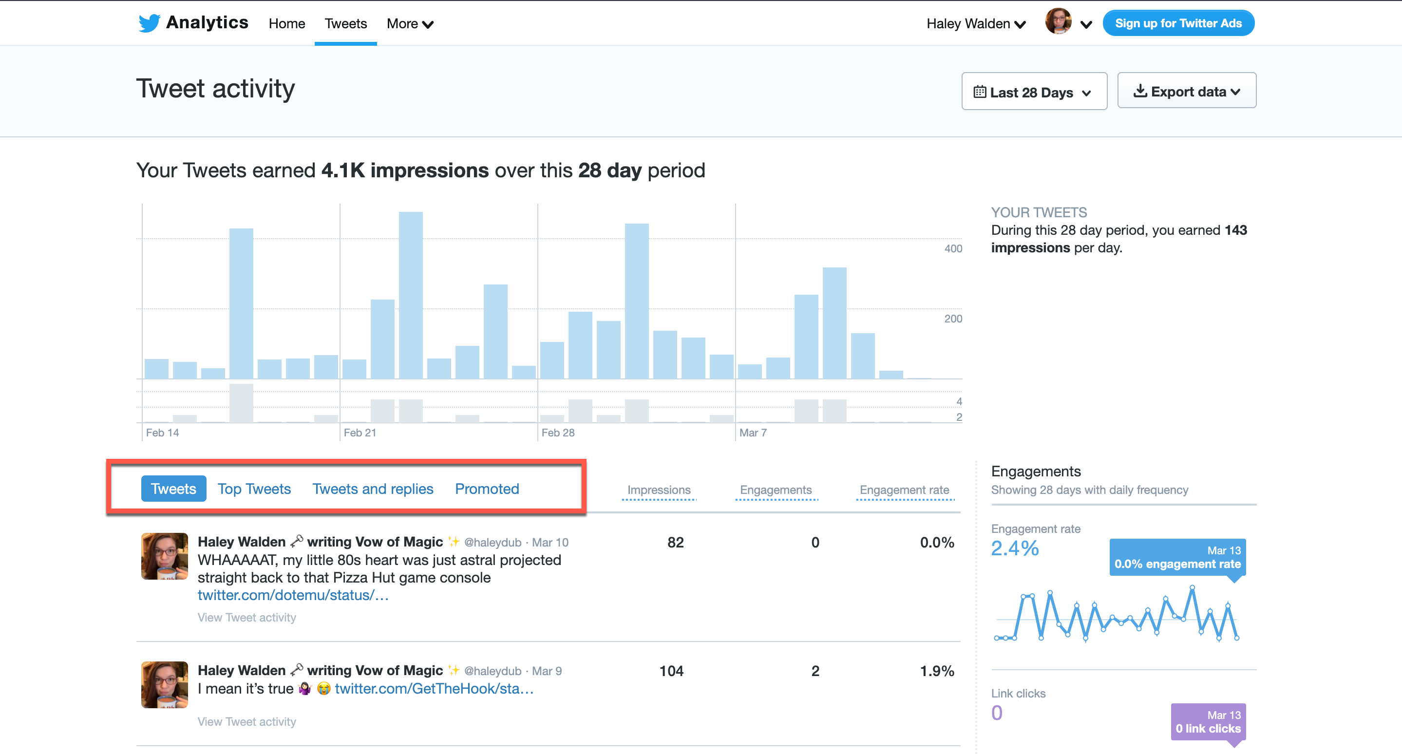 Analisis aktivitas Tweet Anda, termasuk Tweet Promosi, Tweet Teratas, serta Tweet dan Balasan. Anda dapat mengurutkan aktivitas berdasarkan tayangan, keterlibatan, dan tingkat keterlibatan per tweet. Dasbor ini menampilkan periode 28 hari.