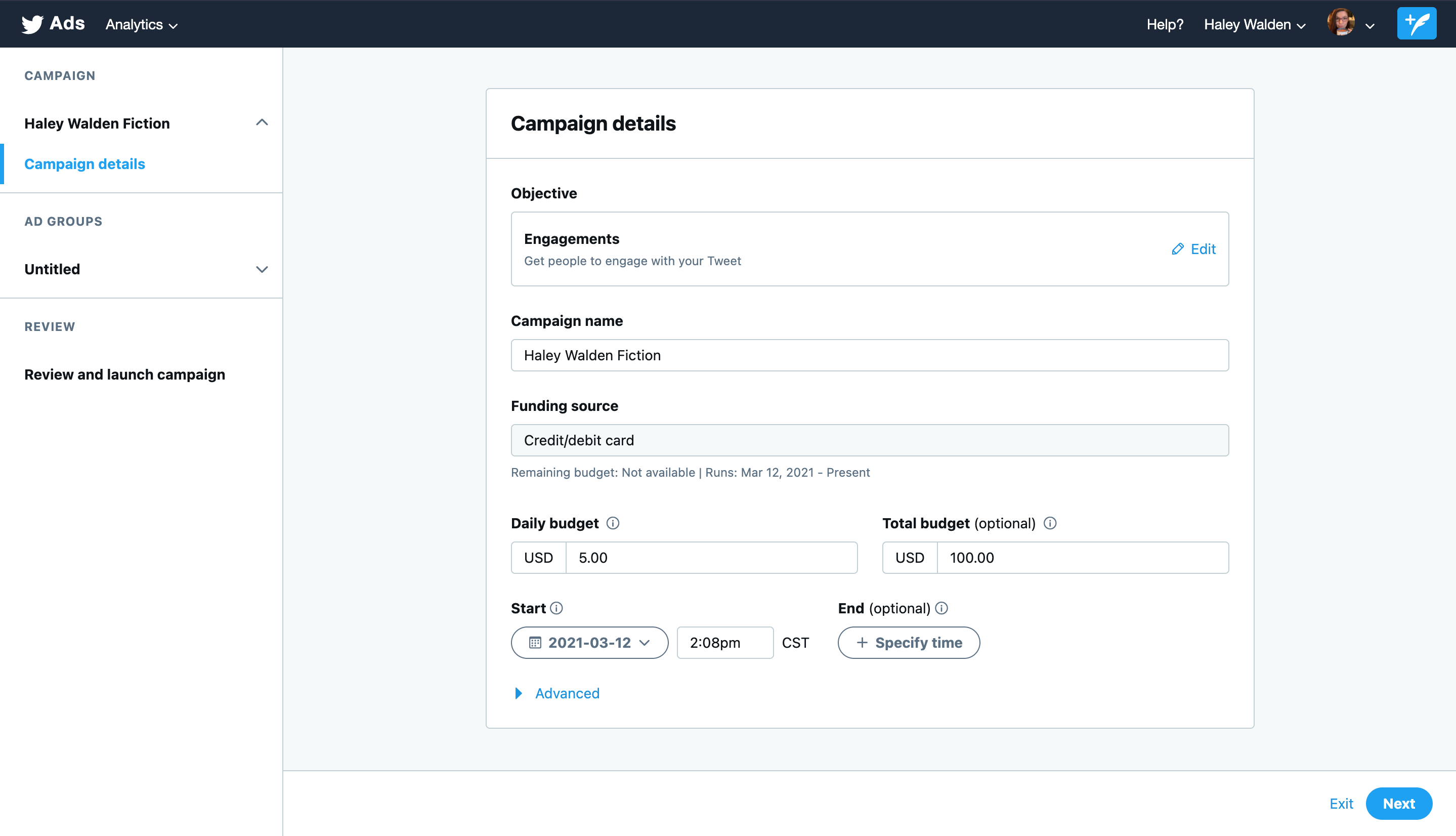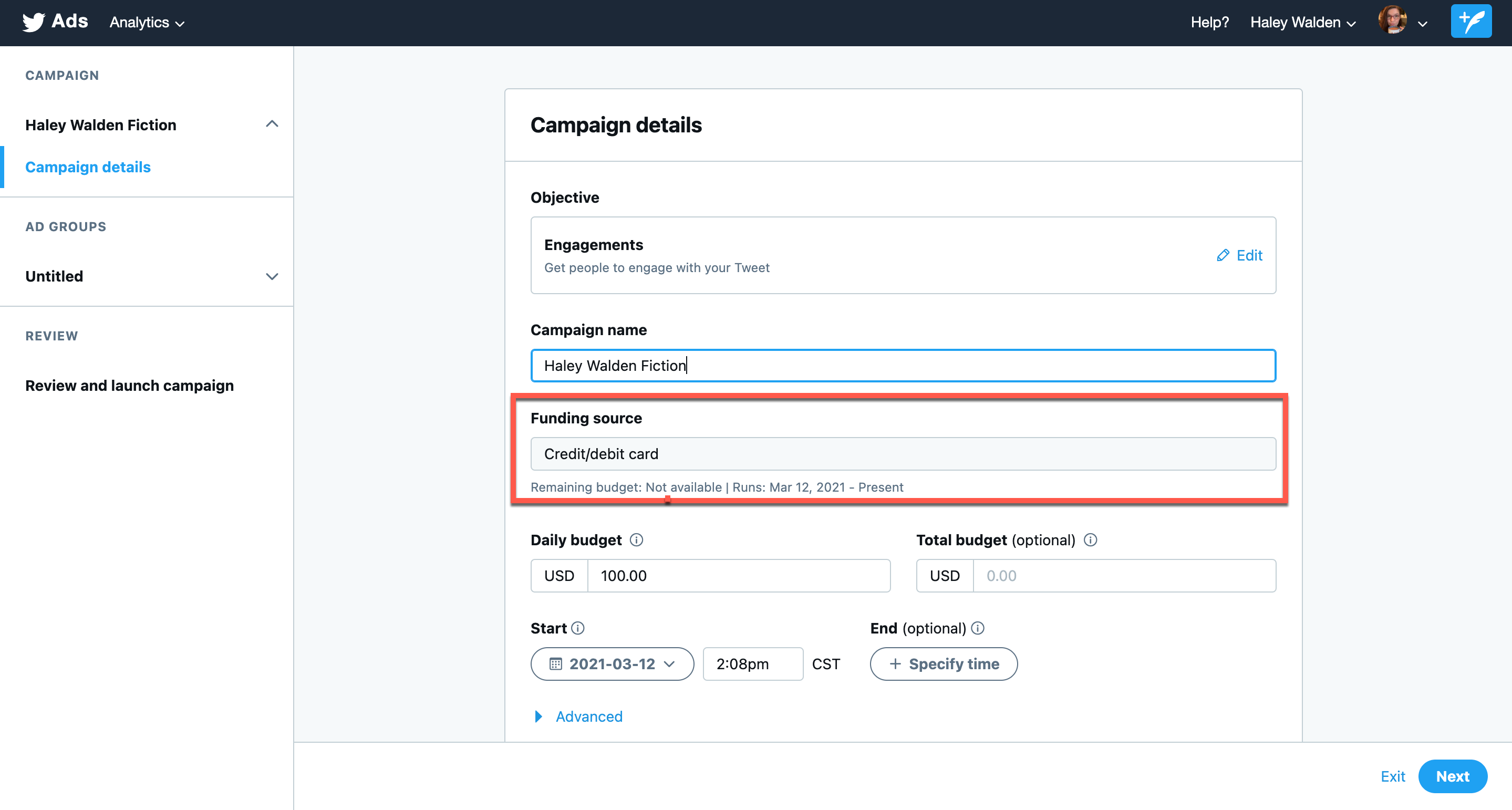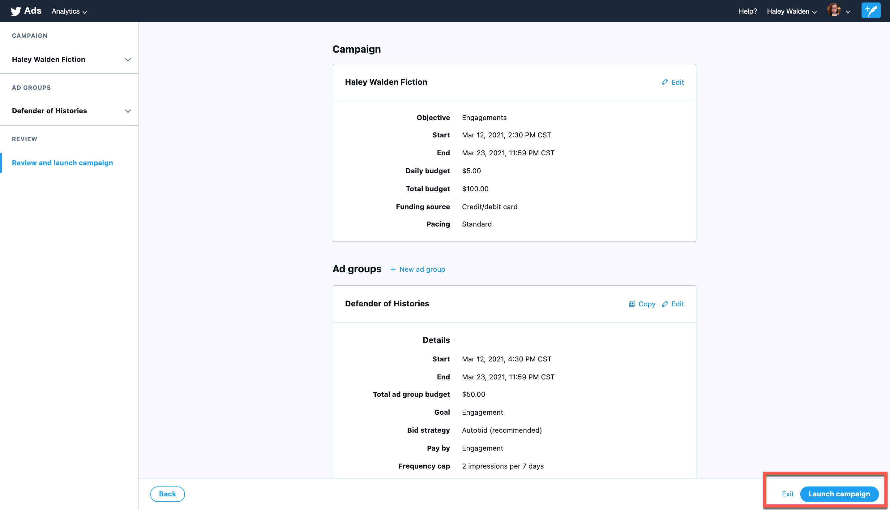 23. Setelah Anda membuat Tweet, Anda akan diarahkan kembali ke Pusat Iklan. Klik Berikutnya di sudut kanan bawah layar, tempat Anda akan diminta untuk meninjau kampanye Anda. Saat Anda siap, klik Luncurkan Kampanye.