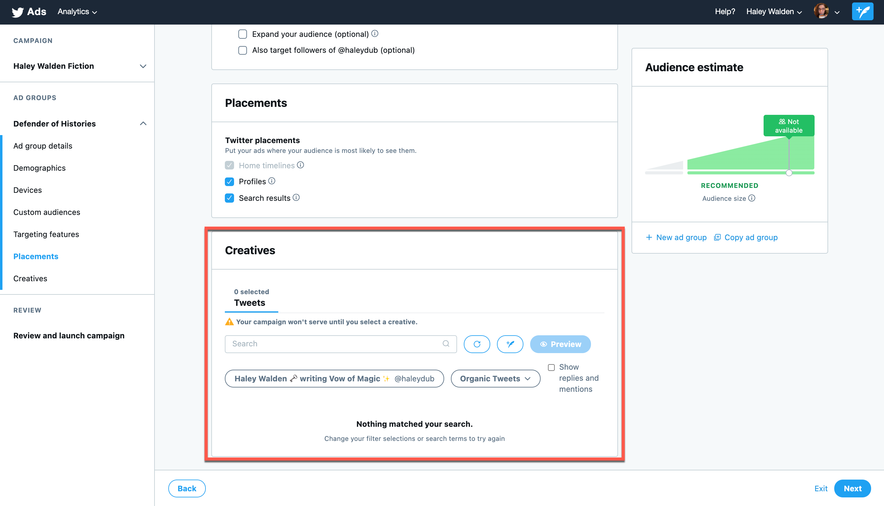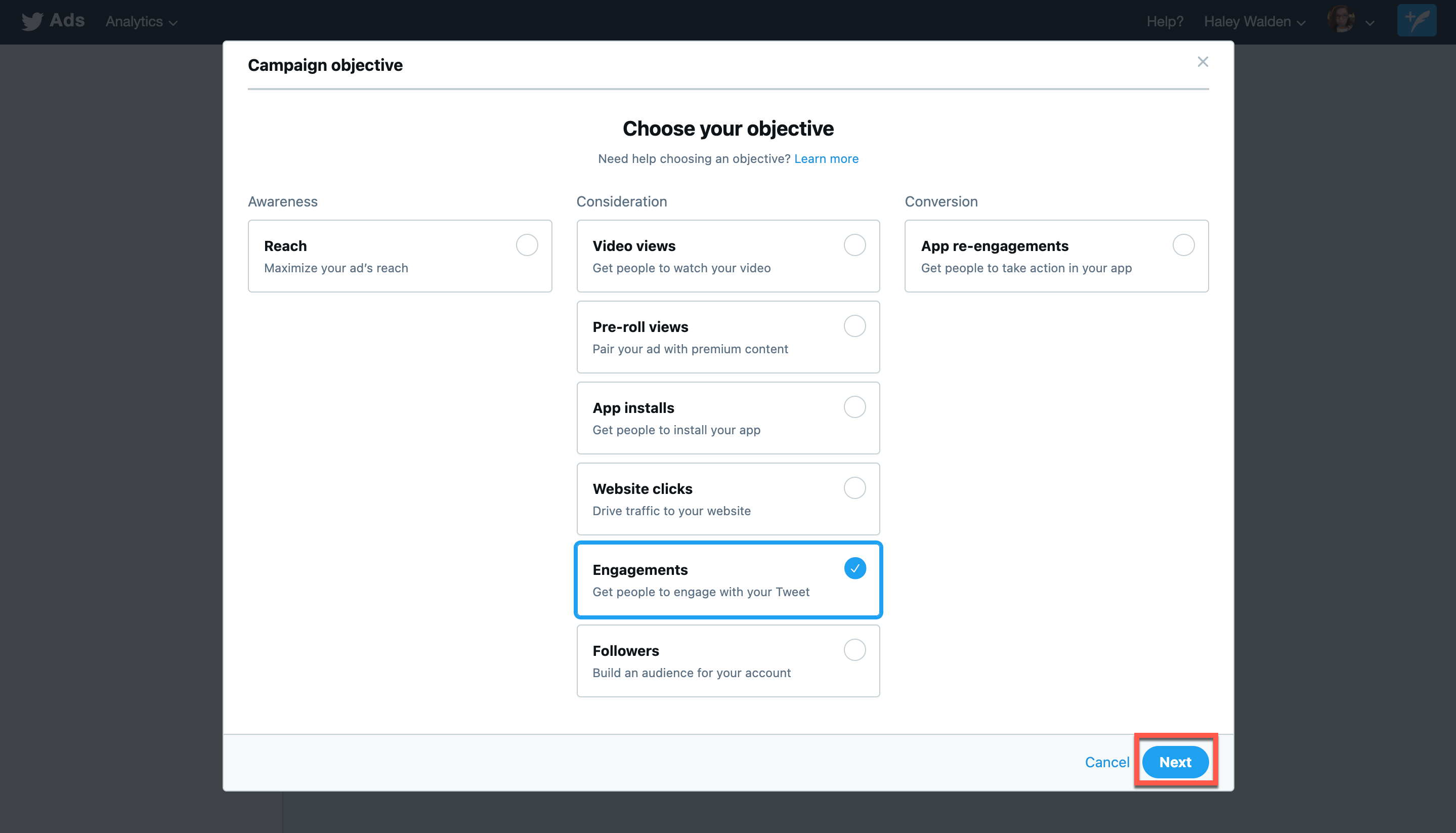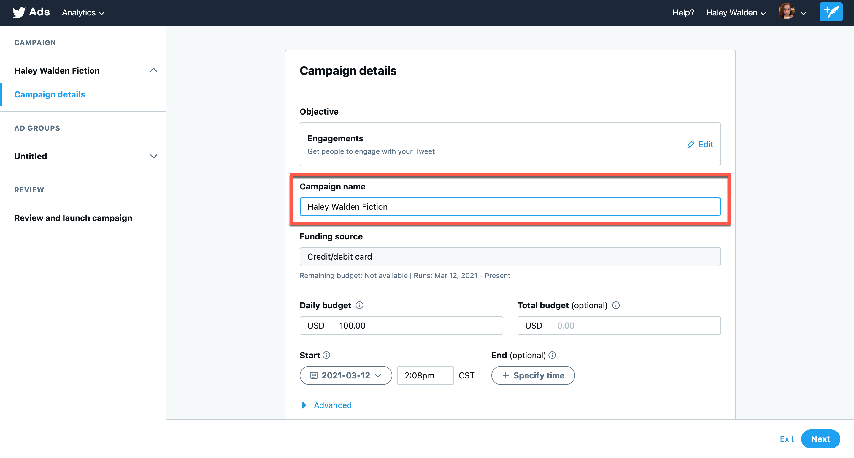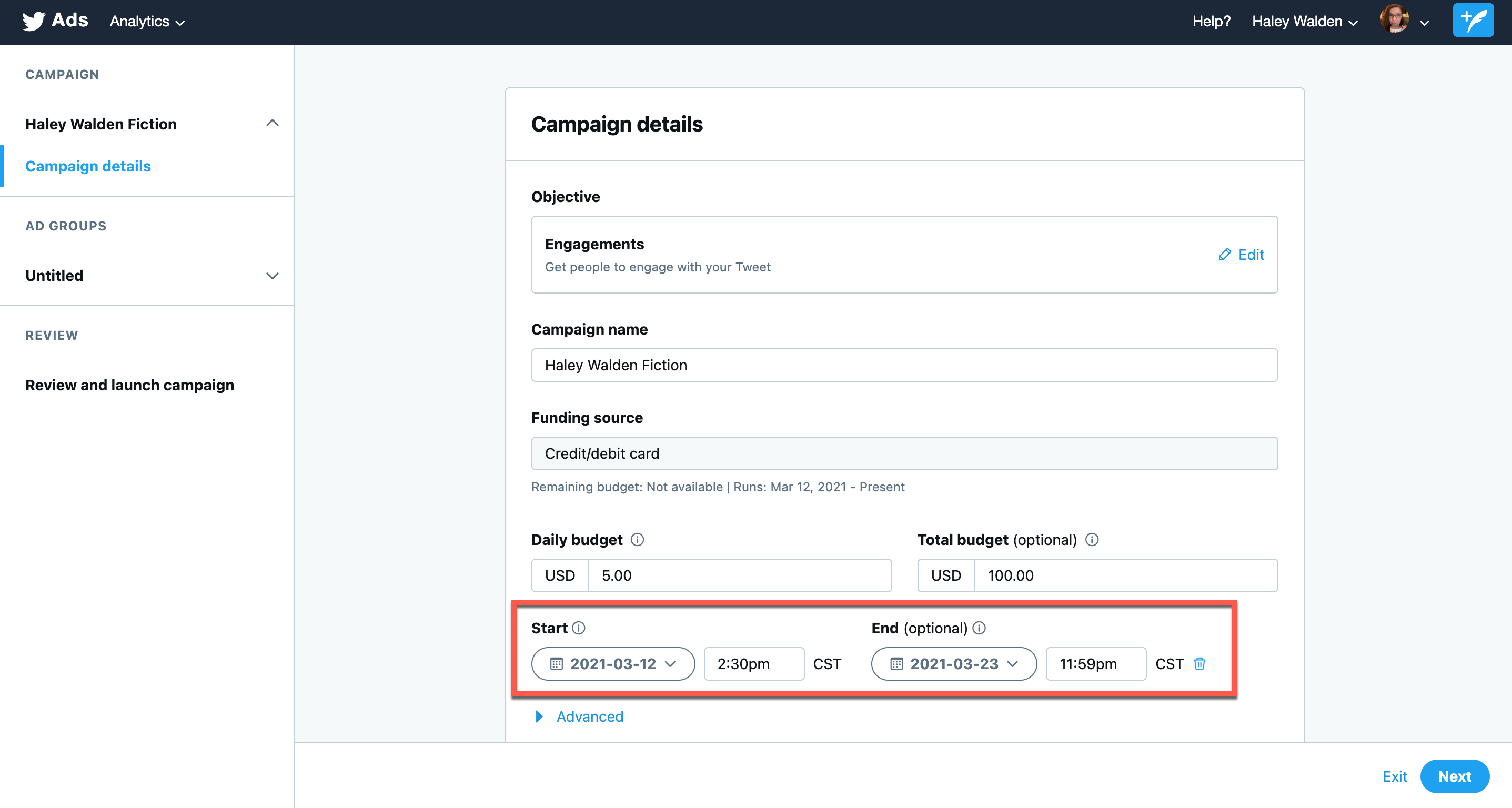 23. Setelah Anda membuat Tweet, Anda akan diarahkan kembali ke Pusat Iklan. Klik Berikutnya di sudut kanan bawah layar, tempat Anda akan diminta untuk meninjau kampanye Anda. Saat Anda siap, klik Luncurkan Kampanye.
