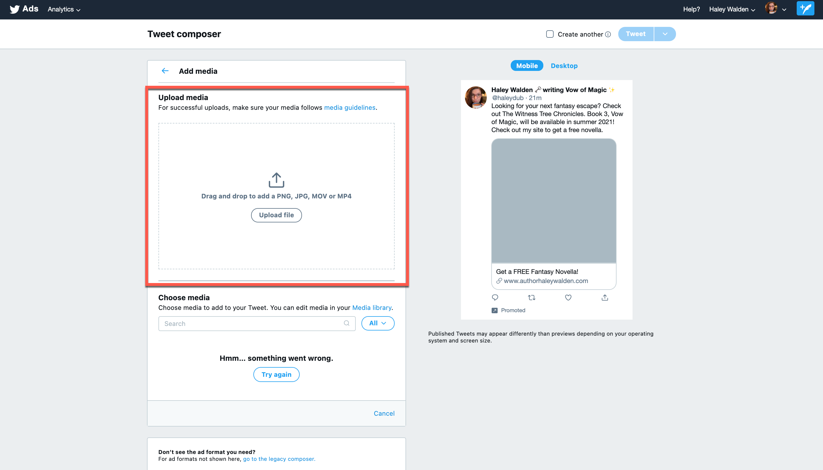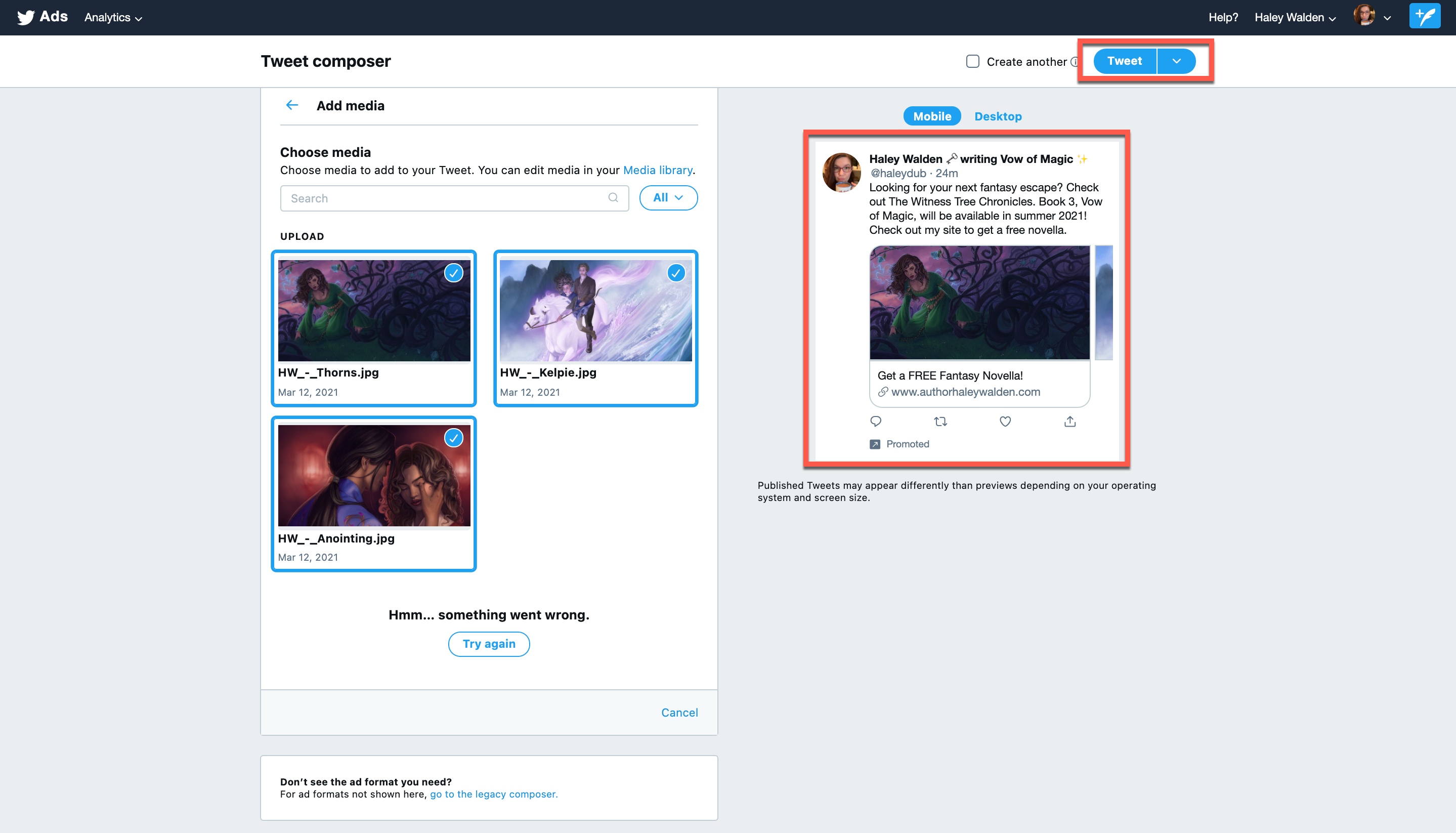 - Maksimalkan penggunaan kartu Twitter Anda, yang merupakan gambar unggulan yang ditampilkan dengan Tweet Promosi. Pastikan untuk menggunakan kartu ringkasan saat mengunggah gambar yang lebih besar. Atau, gunakan opsi kartu multi-gambar, yang memungkinkan hingga empat gambar per Tweet.