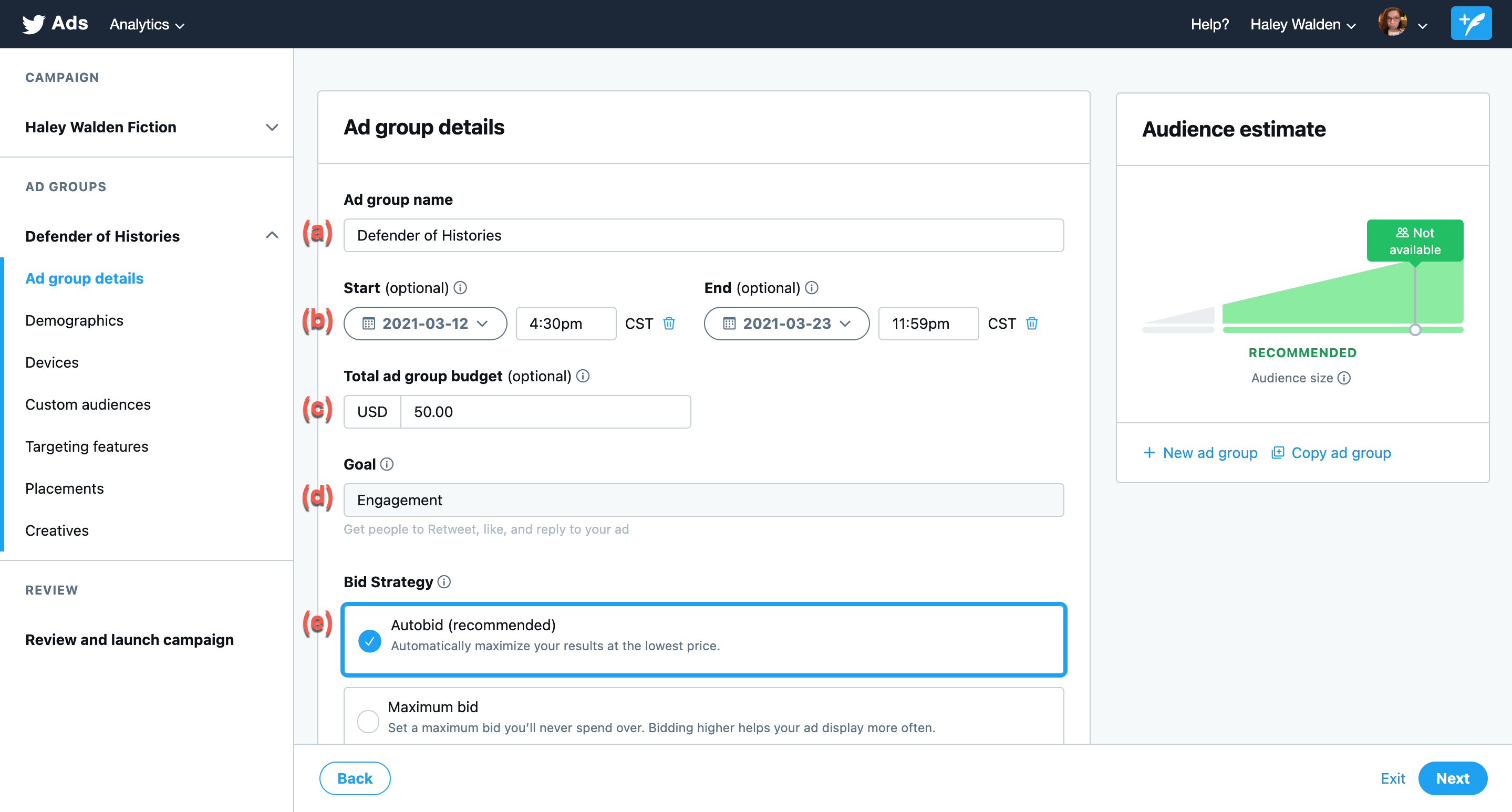 - Batas frekuensi (memungkinkan Anda menyesuaikan jumlah tayangan per hari, atau membiarkan Twitter memilih Anda secara otomatis)
