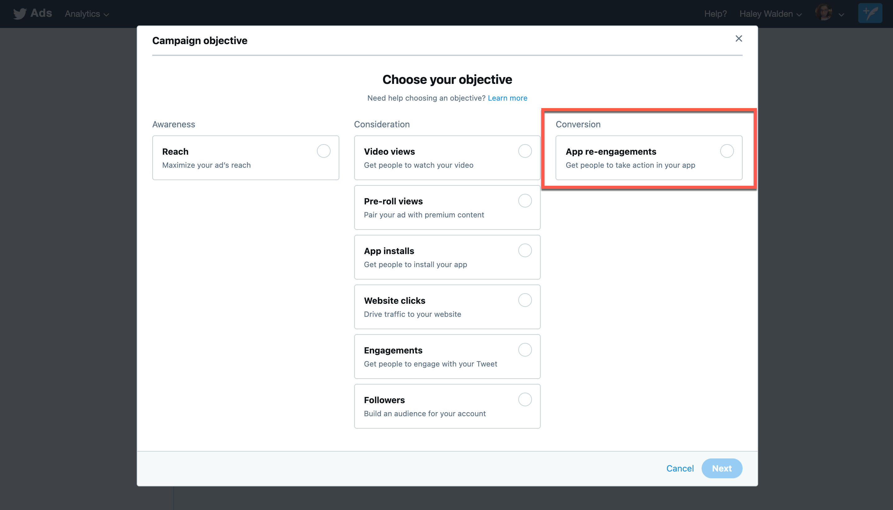 Dalam kategori Konversi, tujuan Anda adalah Keterlibatan Kembali Aplikasi. Opsi ini mendorong pengguna untuk mengambil tindakan dalam aplikasi Anda.
