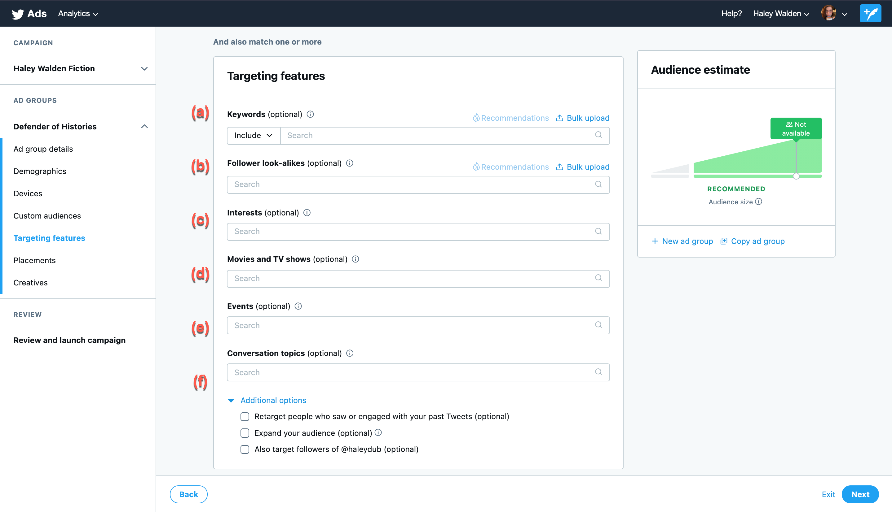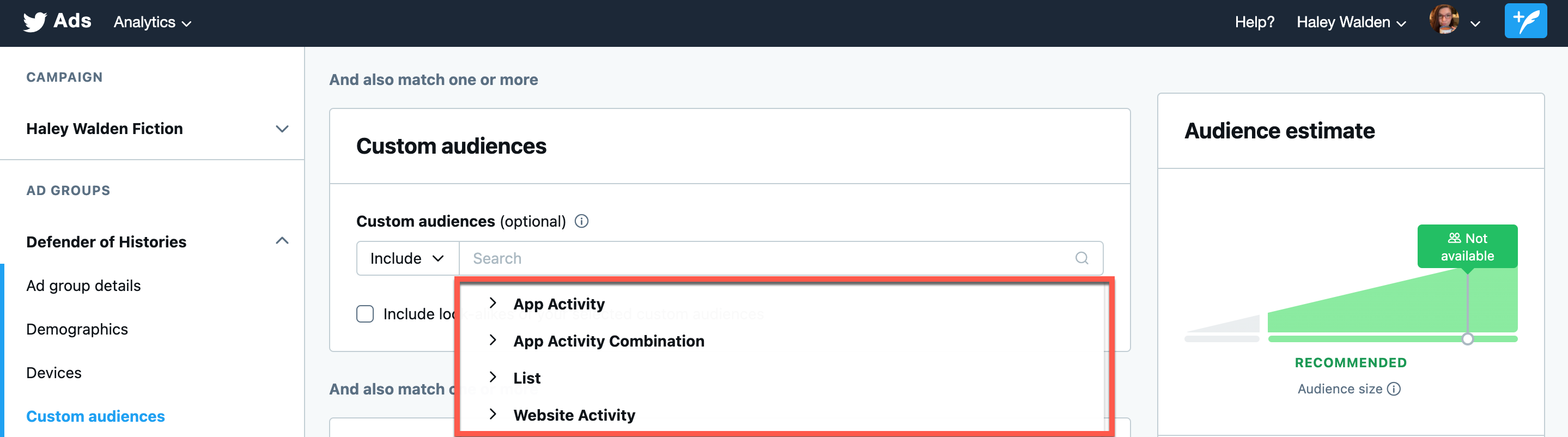 Demikian pula, Anda juga dapat menargetkan ulang individu yang terlibat dengan atau melihat Tweet sebelumnya yang Anda poskan, meningkatkan pemirsa, atau secara khusus menargetkan orang yang mengikuti profil Anda.