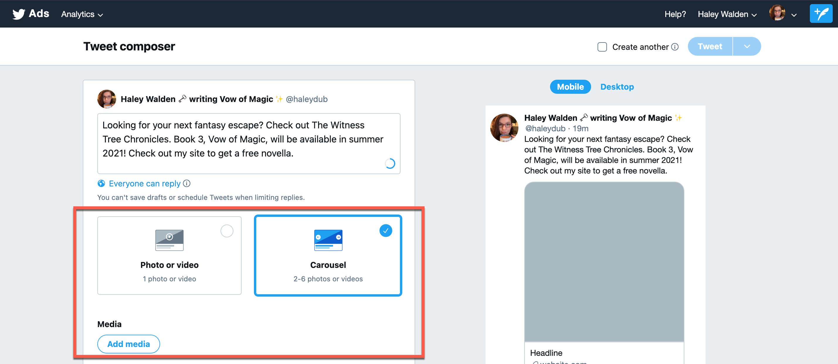 19. Di Tweet Composer, Anda dapat membuat tweet, memilih gambar, video, atau carousel, dan memasukkan informasi Kartu Anda (yang mencakup nama kartu Anda, judul Anda, dan URL yang Anda ingin dikunjungi pengguna Anda). Anda dapat memfilter siapa yang dapat membalas tweet Anda: semua orang, pengguna yang Anda ikuti, atau hanya pengguna yang Anda sebutkan. Selain itu, Anda dapat mengaktifkan apakah Anda ingin tweet muncul sebagai tweet khusus promosi.