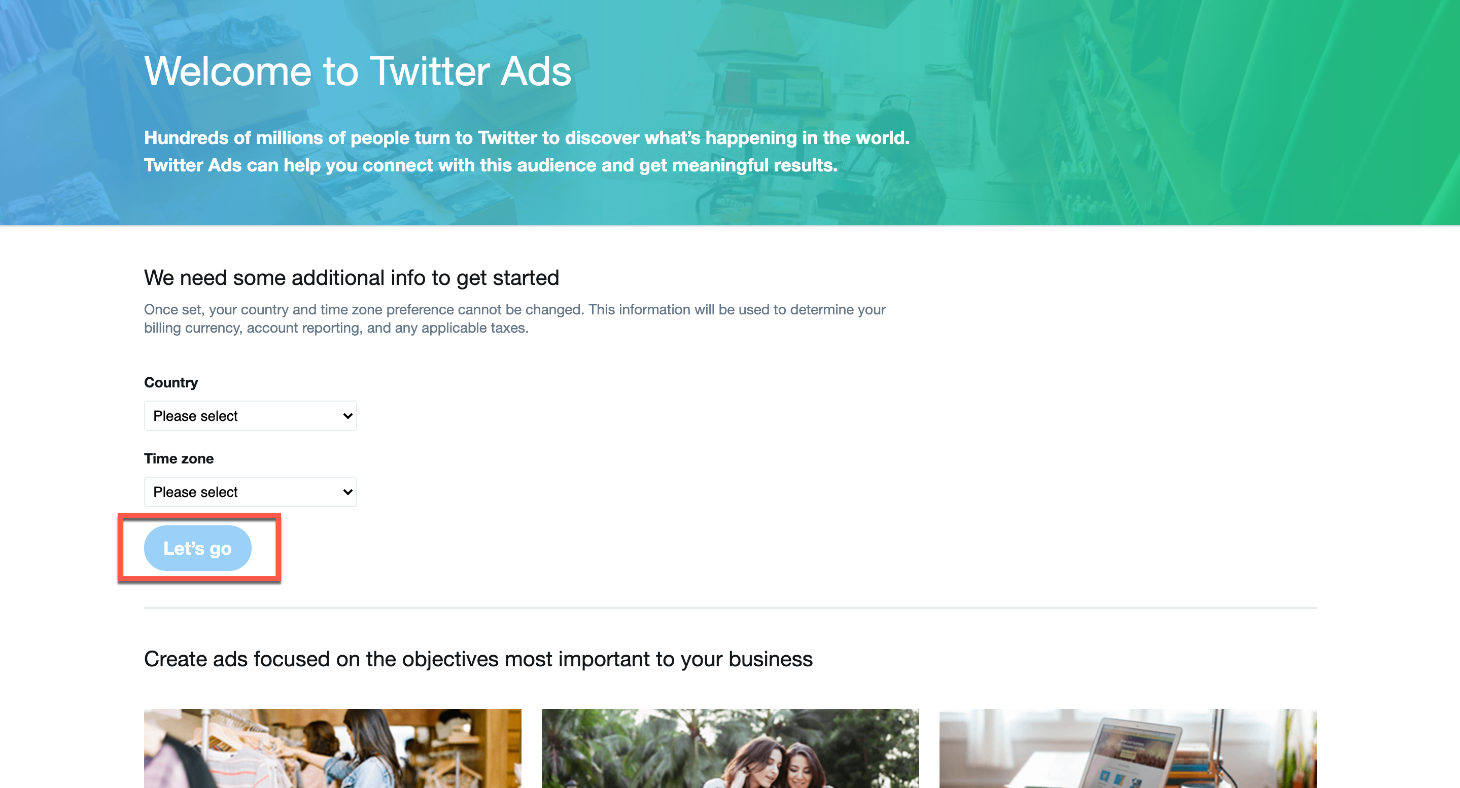 2. Kedua, Twitter akan meminta Anda untuk membagikan beberapa informasi tambahan tentang diri Anda sebelum Anda melanjutkan untuk membuat iklan Anda. Isi informasi yang diperlukan dan klik Let's Go.