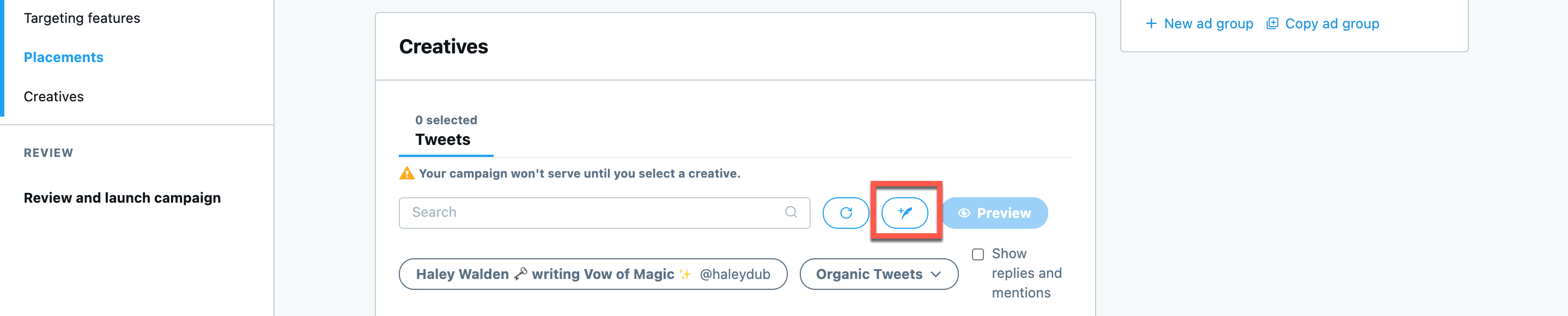 17. Akhirnya, saatnya memilih materi iklan Anda. Anda dapat memilih tweet yang ada dari profil Anda, atau membuat tweet di Twitter Ads Tweet Composer. Jika Anda memilih Tweet yang ada, Anda dapat memfilter menurut tweet organik, tweet terjadwal, atau tweet yang telah dipromosikan sebelumnya.