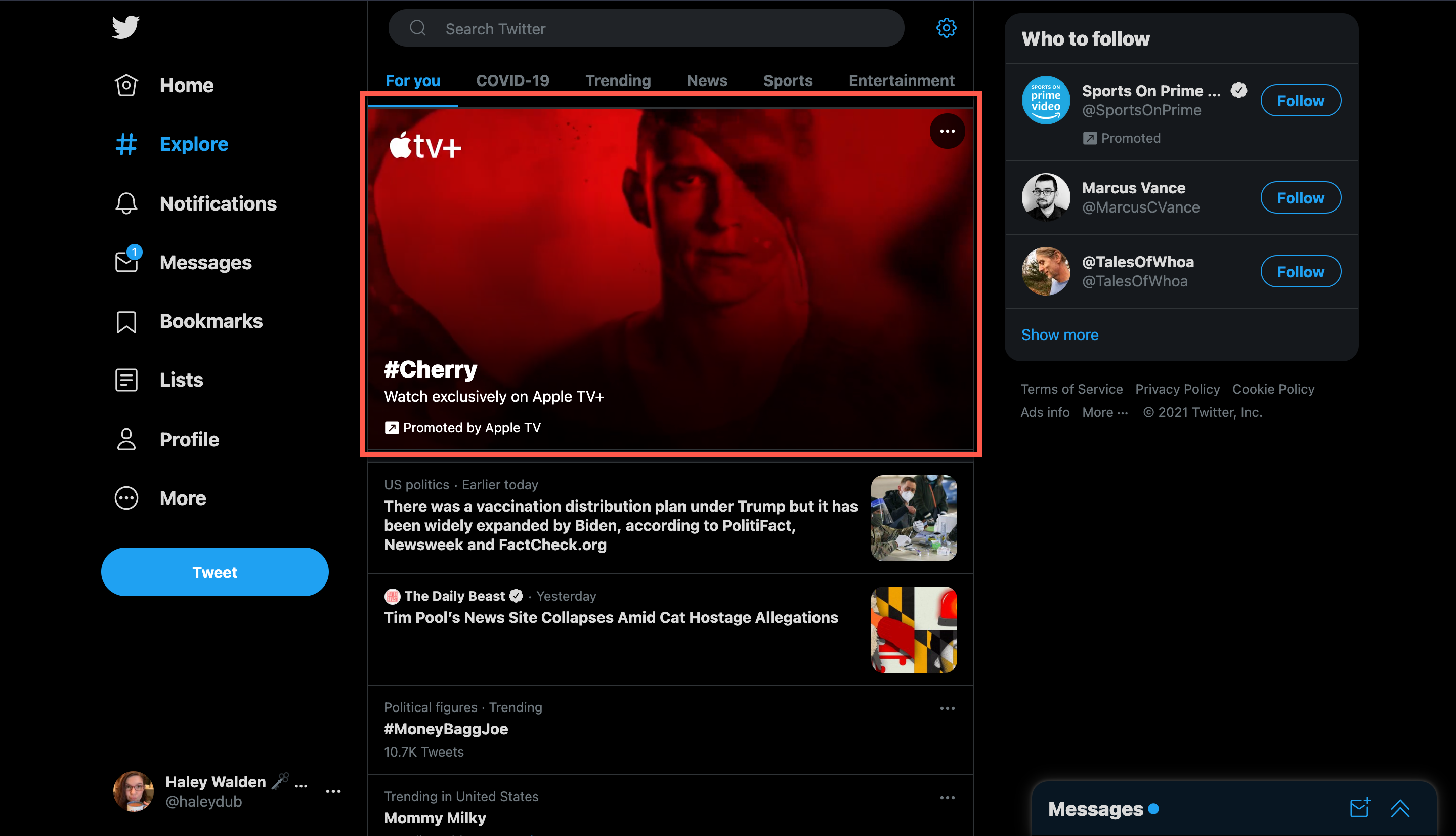 Untuk Tweet Promosi, seperti yang ditunjukkan di atas, merek dapat membayar untuk menampilkan Tweet ke berbagai pengguna. Tweet ini selalu diberi label sebagai iklan, dan akan menampilkan “Dipromosikan” di sudut kiri bawah Tweet.