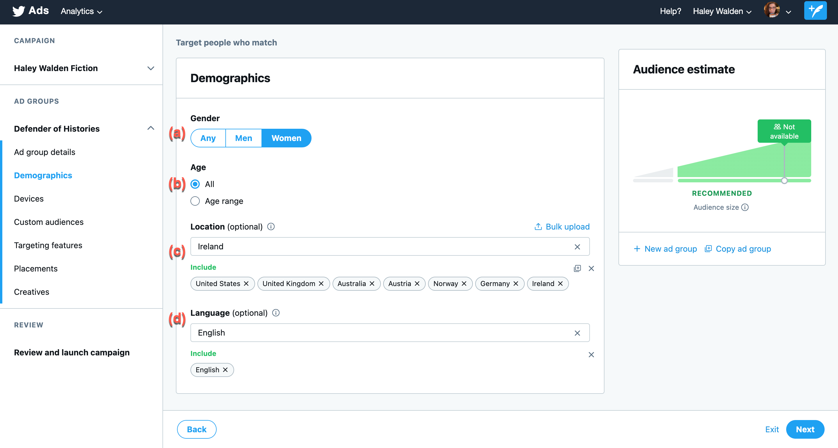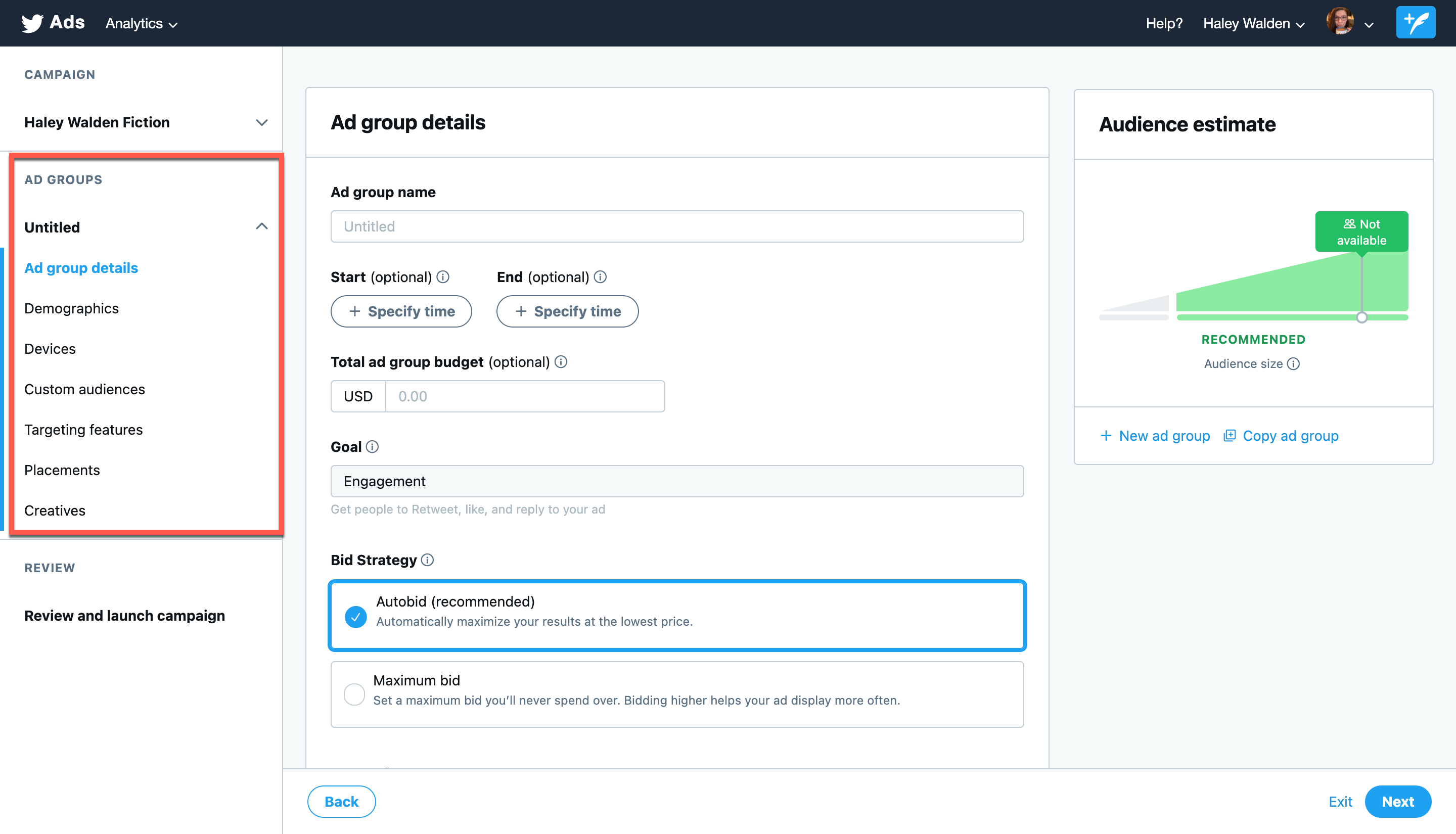 10. Sekarang, saatnya memasukkan semua detail grup iklan Anda. Saat Anda menelusuri halaman ini, Anda akan melihat tempat untuk memasukkan informasi untuk Detail Grup Iklan, Demografi, Perangkat, Pemirsa Khusus, Fitur Penargetan, Penempatan, dan Materi Iklan.