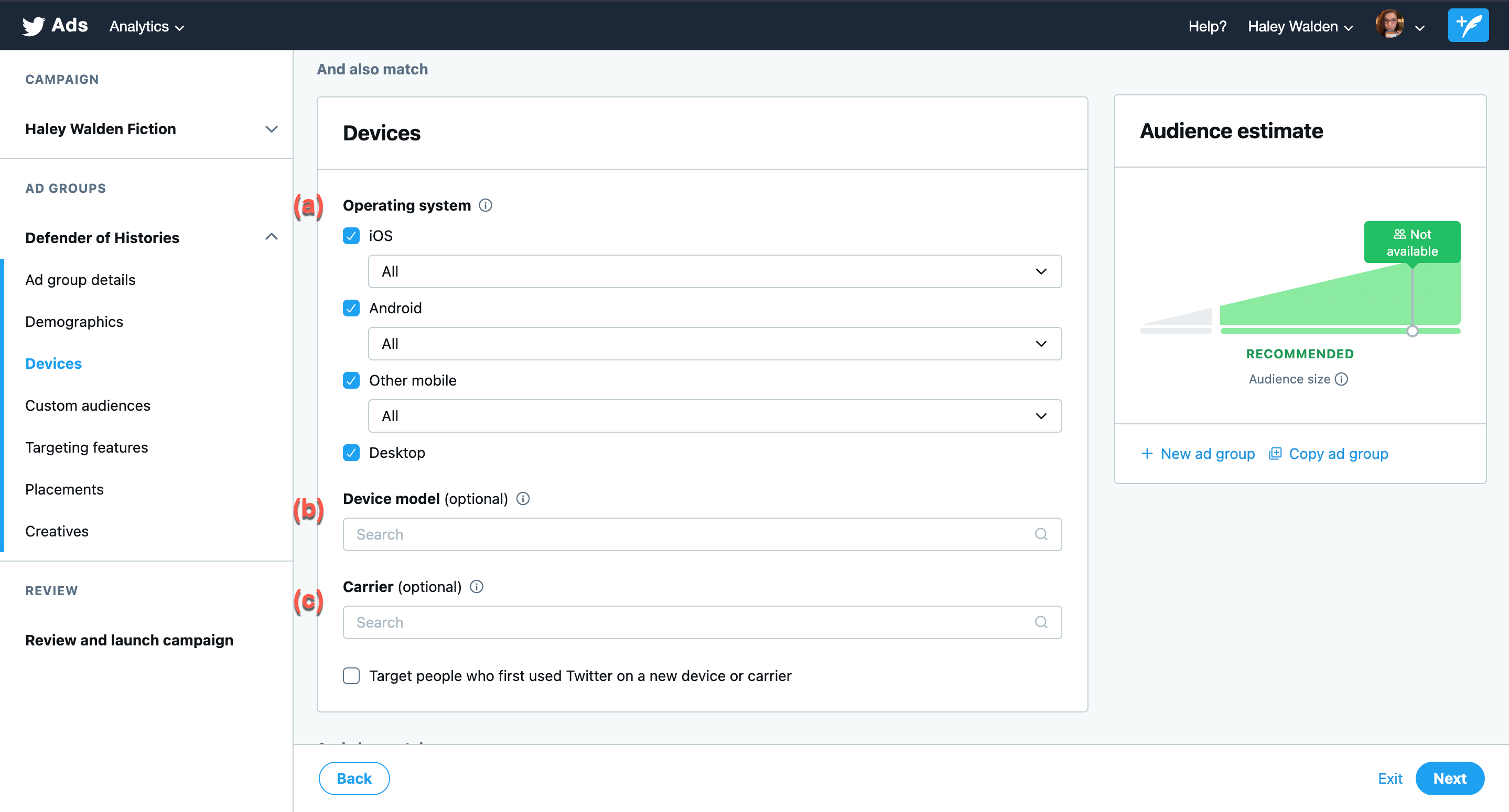 13. Selanjutnya, Anda dapat mempersempit penayangan iklan Anda ke perangkat tertentu, jika Anda mau. Persempit audiens Anda menurut model perangkat iOS, model Android, atau Operator. Anda juga dapat memilih apakah Anda ingin menargetkan pengguna yang pertama kali menggunakan Twitter melalui operator atau perangkat seluler yang lebih baru.