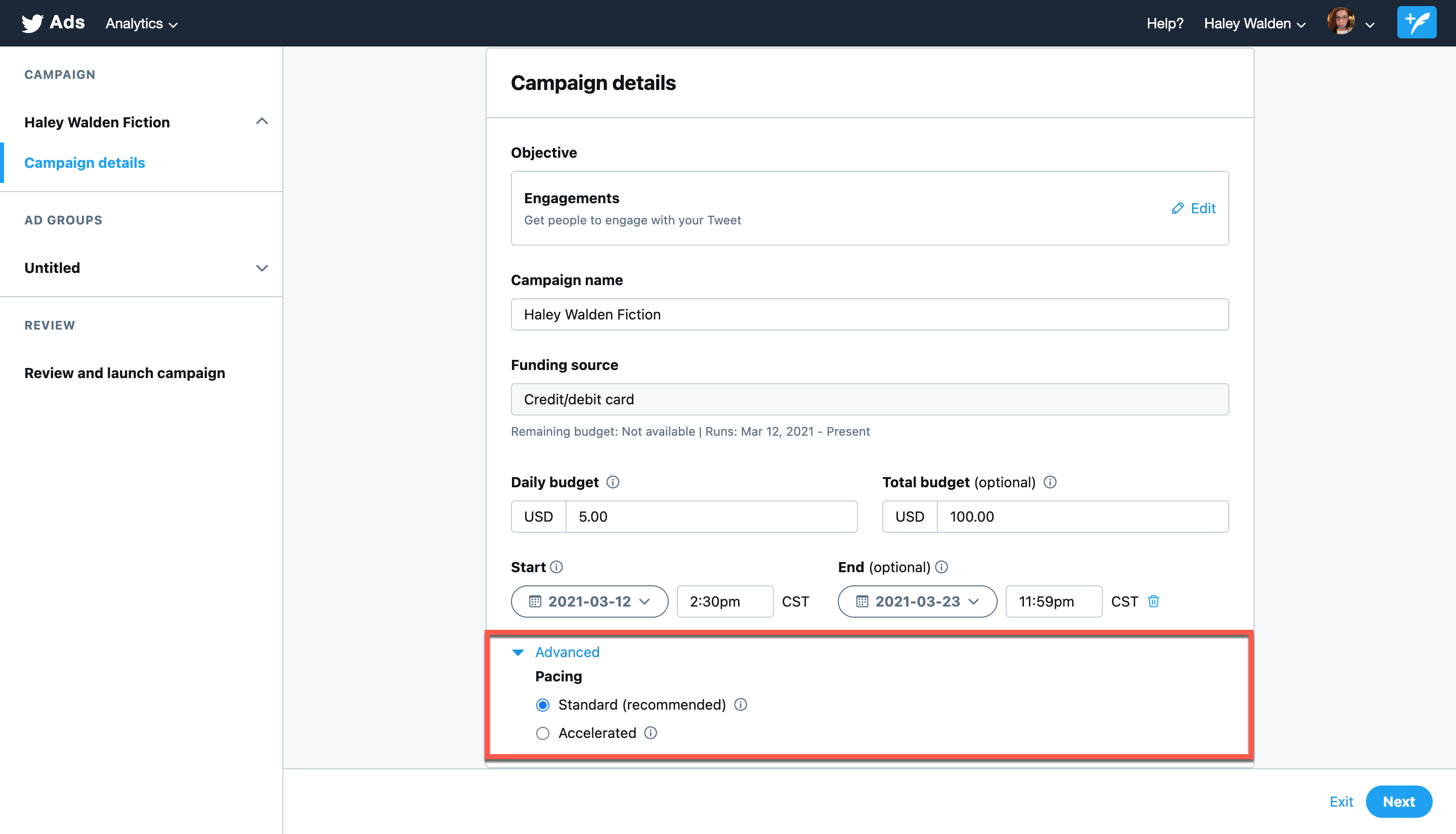 9. Dimungkinkan untuk menyesuaikan tempo kampanye Anda. Untuk melihat opsi Anda, klik Lanjutan. Anda dapat memilih antara kecepatan Standar dan Dipercepat.