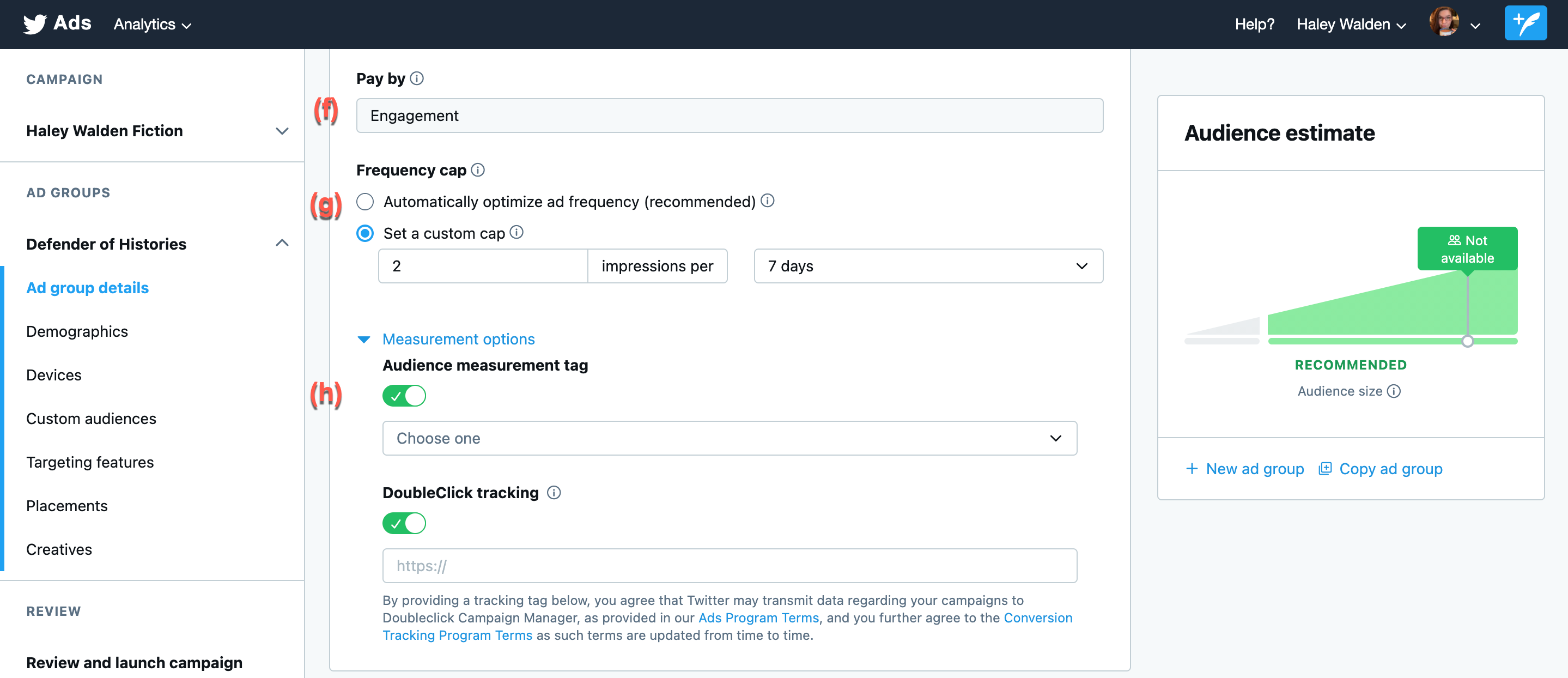 Di bawah Opsi Pengukuran, Anda dapat memilih apakah akan mengaktifkan Tag Pengukuran Pemirsa, Pelacakan DoubleClick, atau keduanya. Ini adalah analitik opsional tambahan yang dapat Anda pilih untuk melacak Tweet Promosi Anda secara lebih efektif.