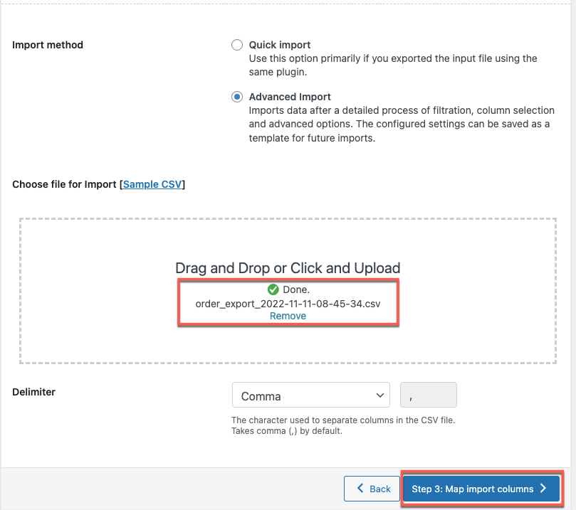 Pilih metode impor sebagai Impor Lanjutan untuk penyaringan detail kolom pemetaan, pilihan pemetaan, dan opsi lanjutan lainnya. Unggah file CSV dari daftar Pesanan.