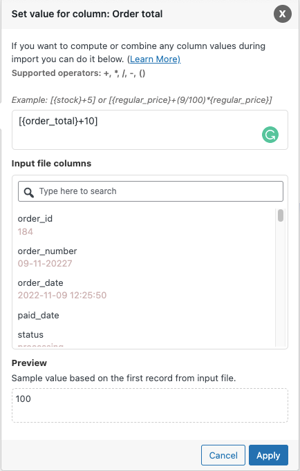 Sekarang mari kita lihat beberapa contoh untuk lebih memahami menambahkan nilai ke kolom pesanan selama Impor Pesanan dengan menggunakan opsi Transform.