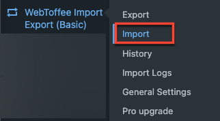 Sekali lagi, dari dasbor WordPress, buka WebToffee Import Export (basic) > Import .