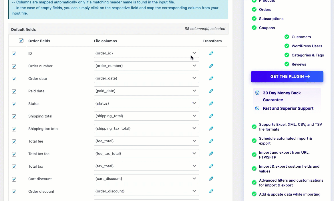 Secara default, WooCommerce memiliki fungsi untuk mengimpor & mengekspor pesanan, untuk memanfaatkan fungsi kolom pemetaan, Anda harus menggunakan plugin ekspor impor pesanan tepercaya dan andal untuk melakukan tugas ini.
