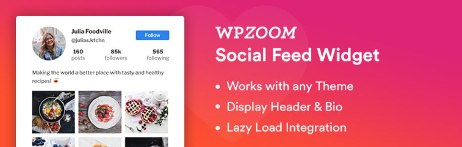 Sebelumnya dikenal sebagai Widget Instagram oleh WPZOOM, WPZOOM Social Feed Widget adalah widget yang sepenuhnya dapat disesuaikan untuk menampilkan feed Instagram di situs WordPress Anda. Dengan menggunakan dinding Instagram untuk situs WordPress ini, Anda bahkan dapat menampilkan akun Instagram termasuk jumlah pengikut, pengikut, posting, bio, dan nama pengguna. Jadi, ini bisa menjadi pilihan yang bagus untuk Anda terutama jika Anda ingin memperkenalkan akun Instagram di posting blog Anda.