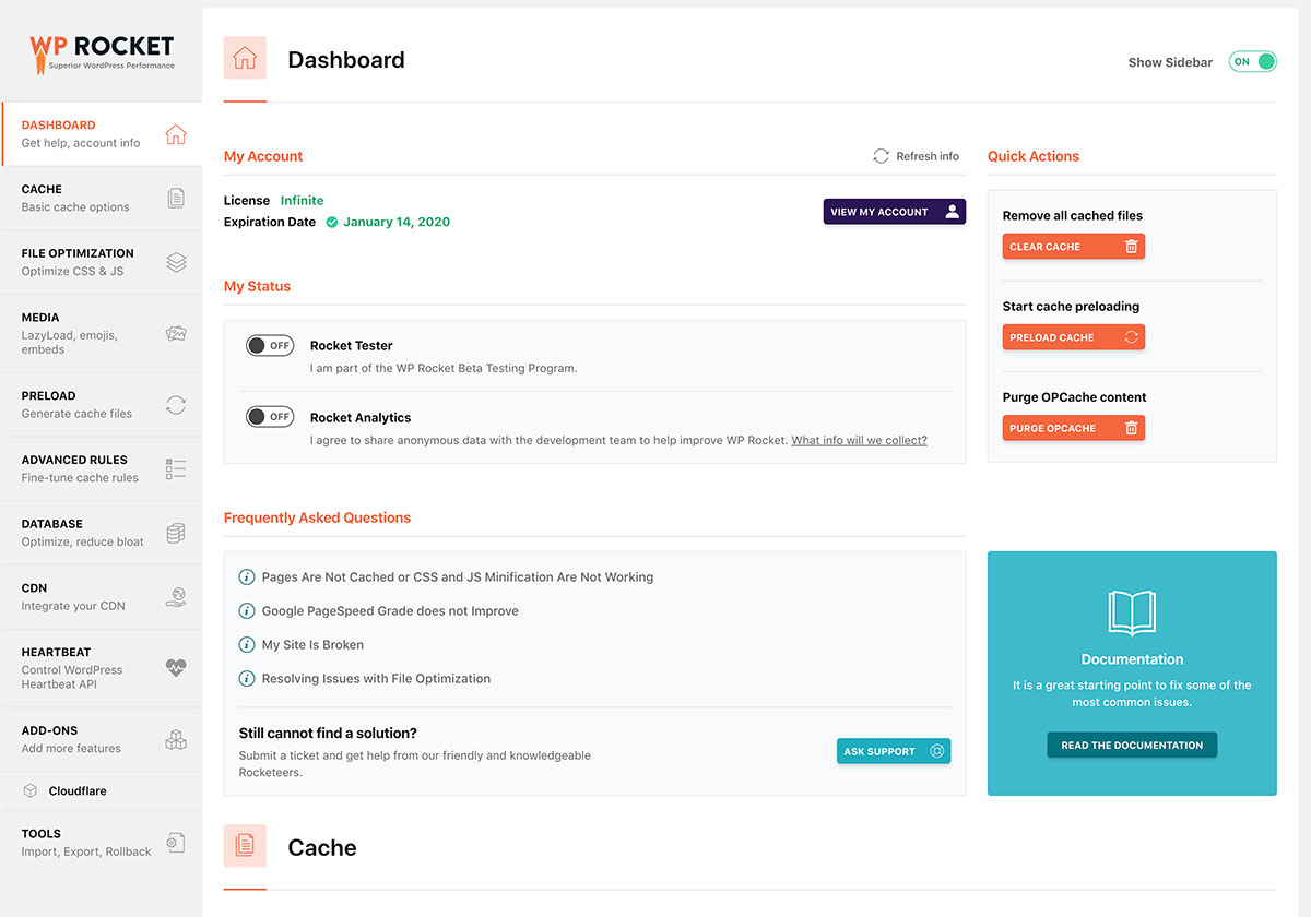 Anda dapat menjalankan situs eCommerce karena kompatibilitas penuh dengan plugin eCommerce. Ini kompatibel dengan CloudFlare, dapat menggunakan cache browser. Plugin ini menawarkan pengoptimalan font dan gambar Google bersama dengan kompatibilitas multisitus dan multibahasa. Selain fitur-fitur ini, WP Rocket menyediakan prefetching DNS dan sangat ramah pengembang.
