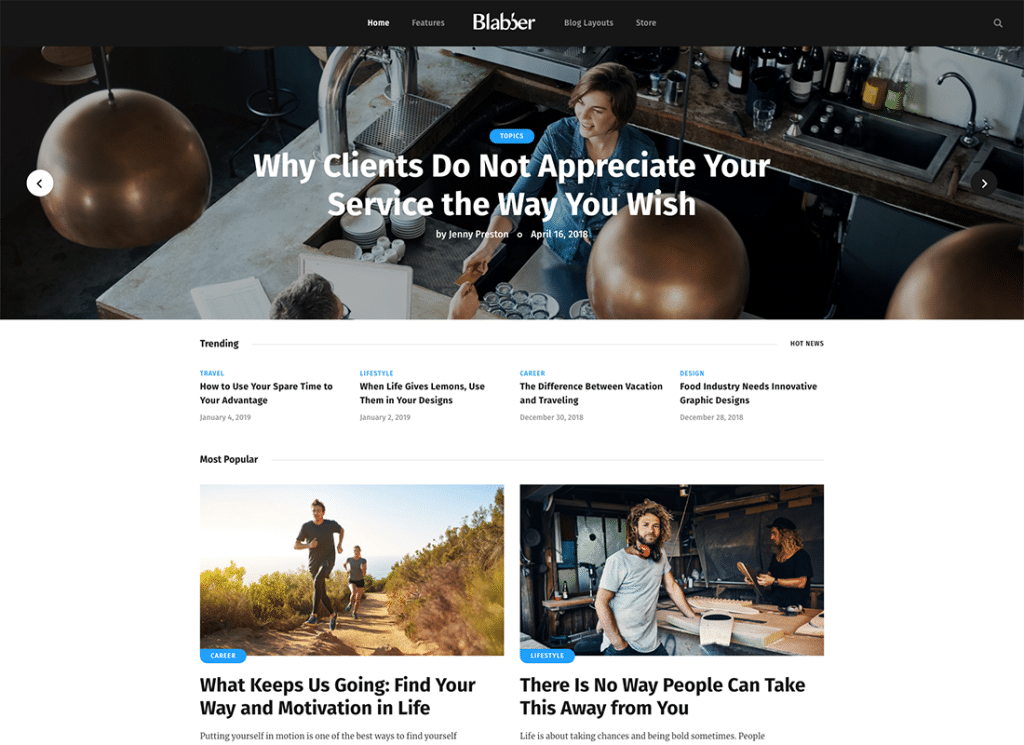 Dengan demikian, Blabber sangat cocok untuk proyek web berita dunia, afiliasi, atau game. Periksa koleksi demo cantiknya dan pilih salah satu yang paling cocok untuk Anda. Itu adalah titik awal yang bagus untuk situs web masa depan Anda. Untuk blog, Anda juga memiliki beberapa tata letak posting, seperti catur, portofolio, atau klasik. Kamu putuskan.
