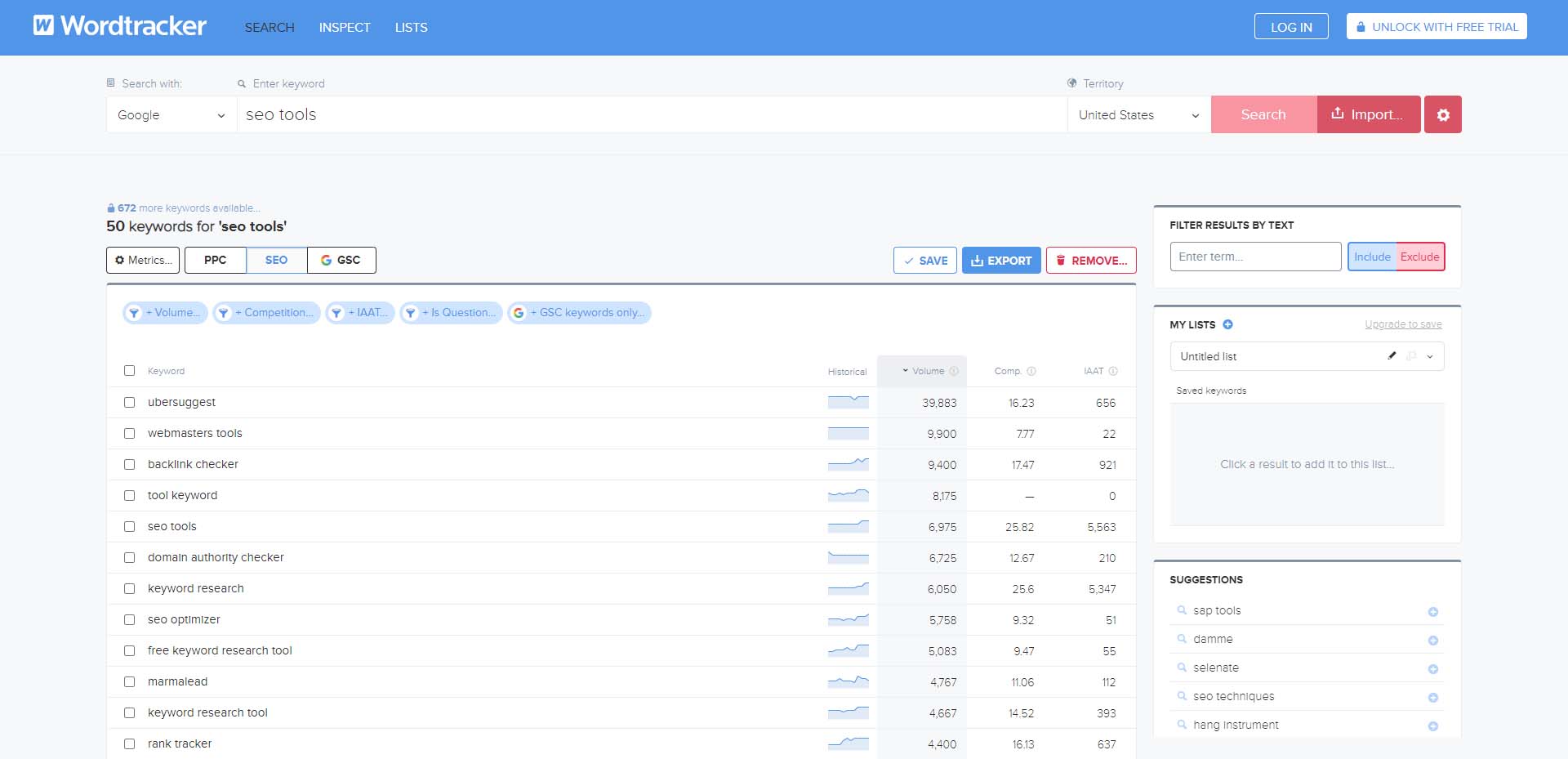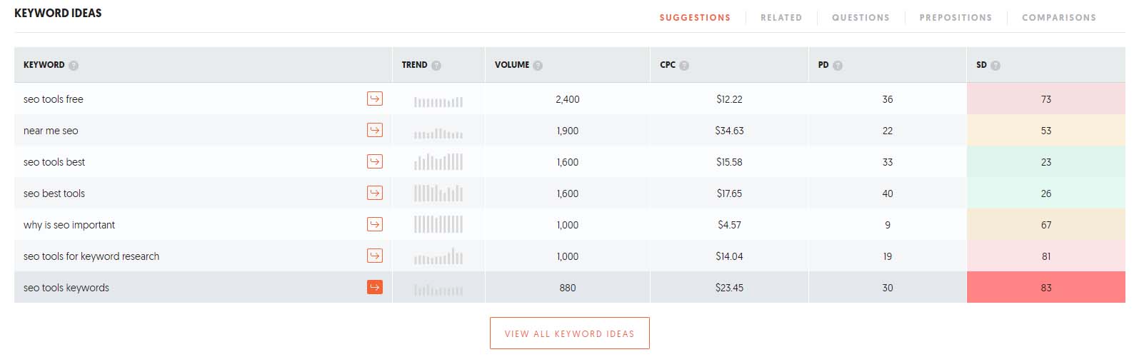 Come puoi vedere, ha creato molti suggerimenti di parole chiave relativi al termine strumenti SEO.