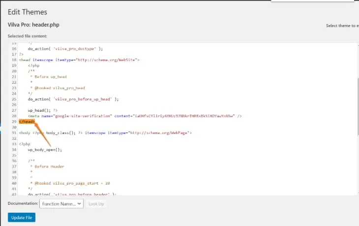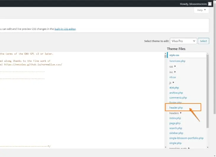 Vai al file di intestazione del tema (header.php) sul lato destro. Un editor di codice apparirà al centro dello schermo.