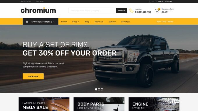 Qualunque sia il tipo di sito Web di ricambi auto che devi creare, ci sono buone probabilità che una delle demo di Chromium sia adatta. Per dare al tuo negozio un aspetto professionale, funzionalità come gli effetti immagine attivati al passaggio del mouse e i caroselli dei prodotti sono pronti per l'uso. Se desideri eseguire promozioni nel tuo negozio di ricambi auto, puoi utilizzare il conto alla rovescia per evidenziare eventuali offerte sensibili al fattore tempo.