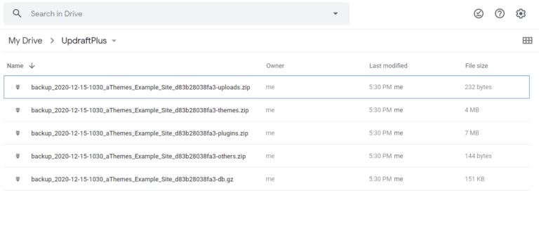 Se vai su Google Drive, dovresti anche vedere i tuoi file di backup nella cartella UpdraftPlus . Per un backup completo del sito, avrai cinque file separati (ne parleremo più avanti):