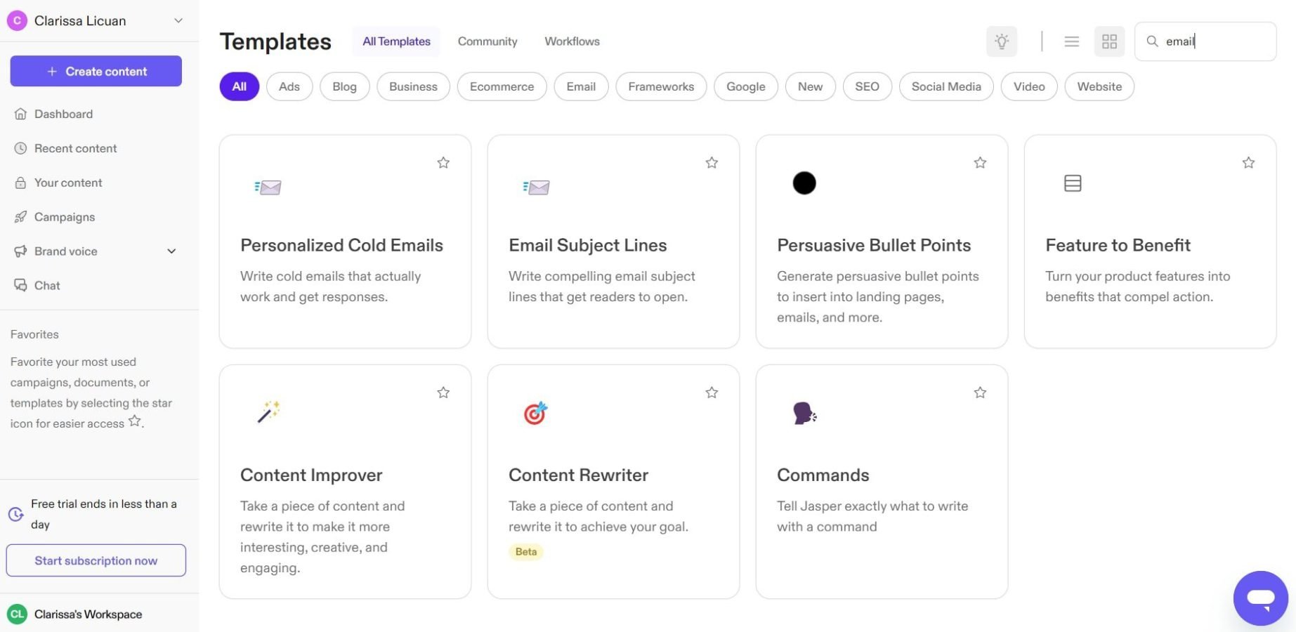 Jasper è uno strumento di scrittura basato sull'intelligenza artificiale che aiuta a generare e-mail in base alle tue richieste. Fornisce modelli per diversi tipi di contenuto, comprese le e-mail. Con i modelli e-mail di Jasper, puoi scegliere se scrivere e-mail fredde personalizzate, creare righe di oggetto, elenchi puntati persuasivi per le e-mail o persino migliorare i contenuti. Queste funzionalità ti consentono di creare e-mail accattivanti per marketing, vendite, coinvolgimento e altro ancora. Inoltre, puoi personalizzare i modelli per garantire che tutte le email del tuo dominio mantengano un marchio coerente.