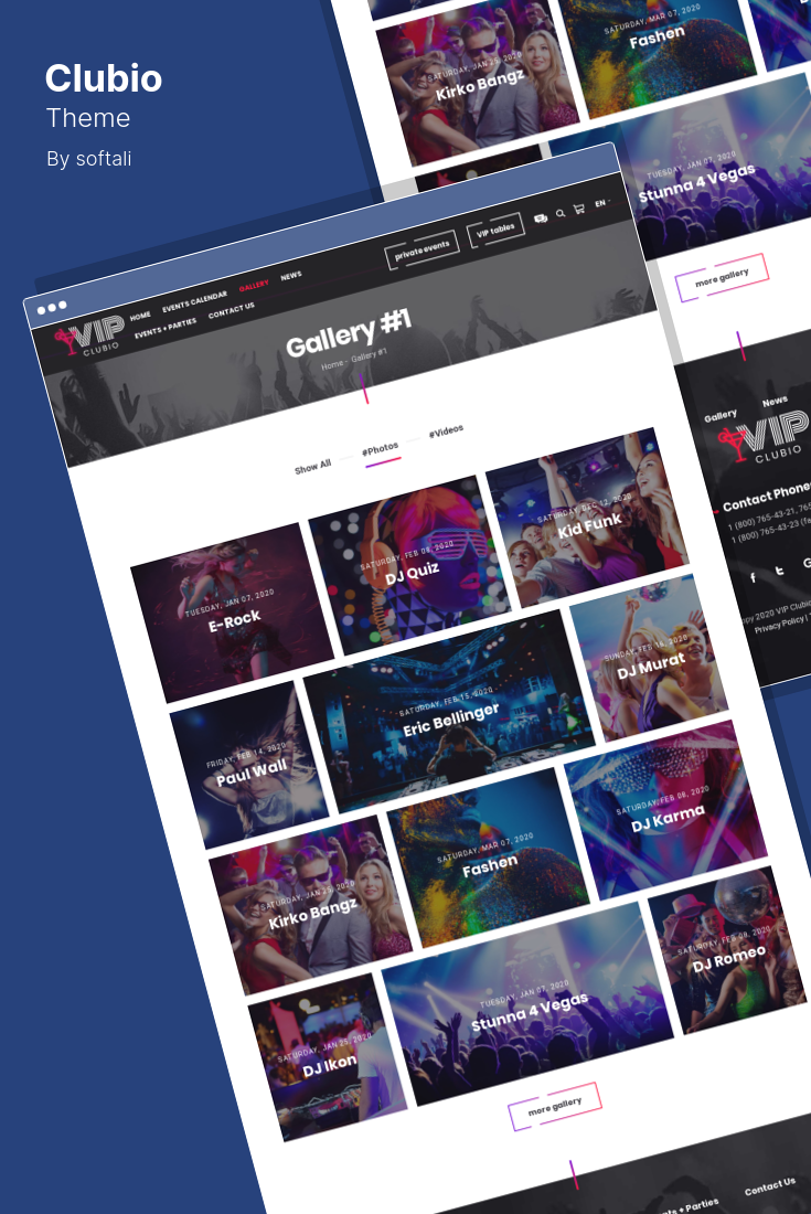 Il tema ha caratteristiche uniche, come un calendario degli eventi che ti consente di programmare eventi speciali che ti aiuteranno ad attirare gli ospiti ai concerti e ai festival del tuo club.