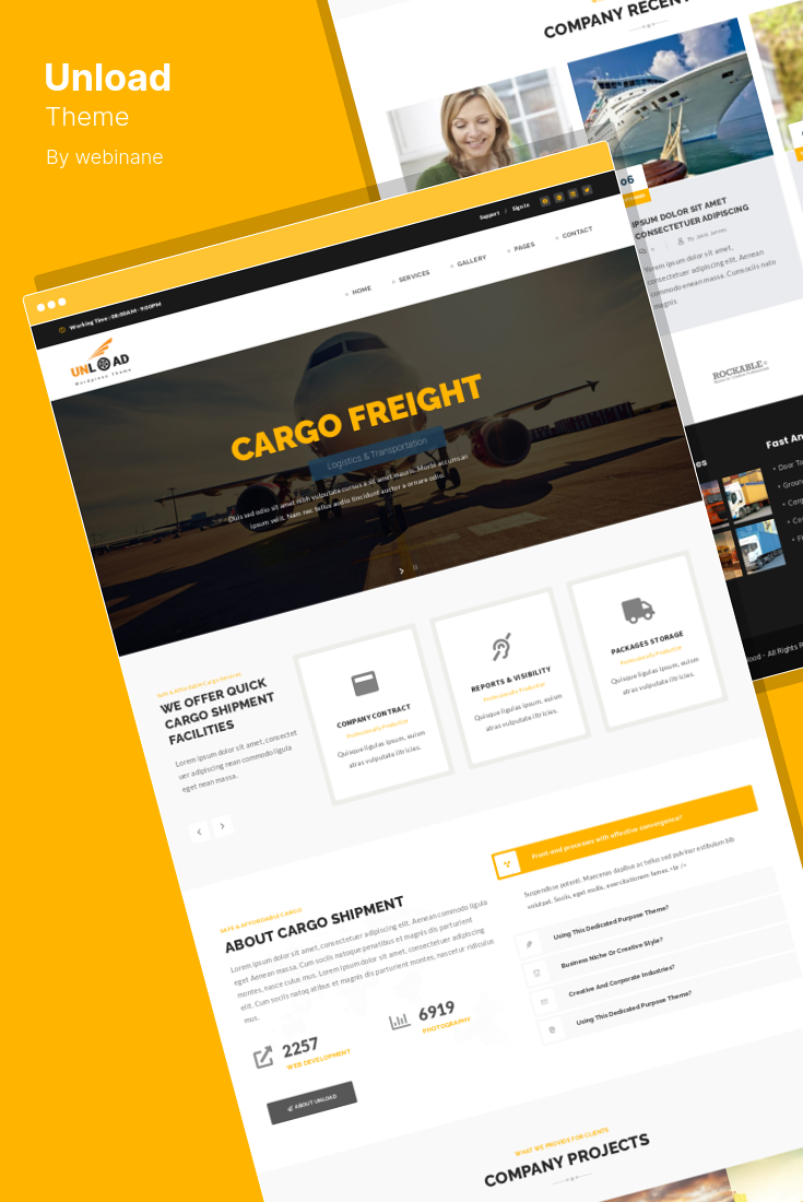 Questo tema ha un design intuitivo che ben si adatta alle aziende che si occupano di servizi di trasporto aereo di merci, servizi di trasporto merci su camion, diversi servizi logistici, servizi di trasporto aereo o lavori nella logistica.