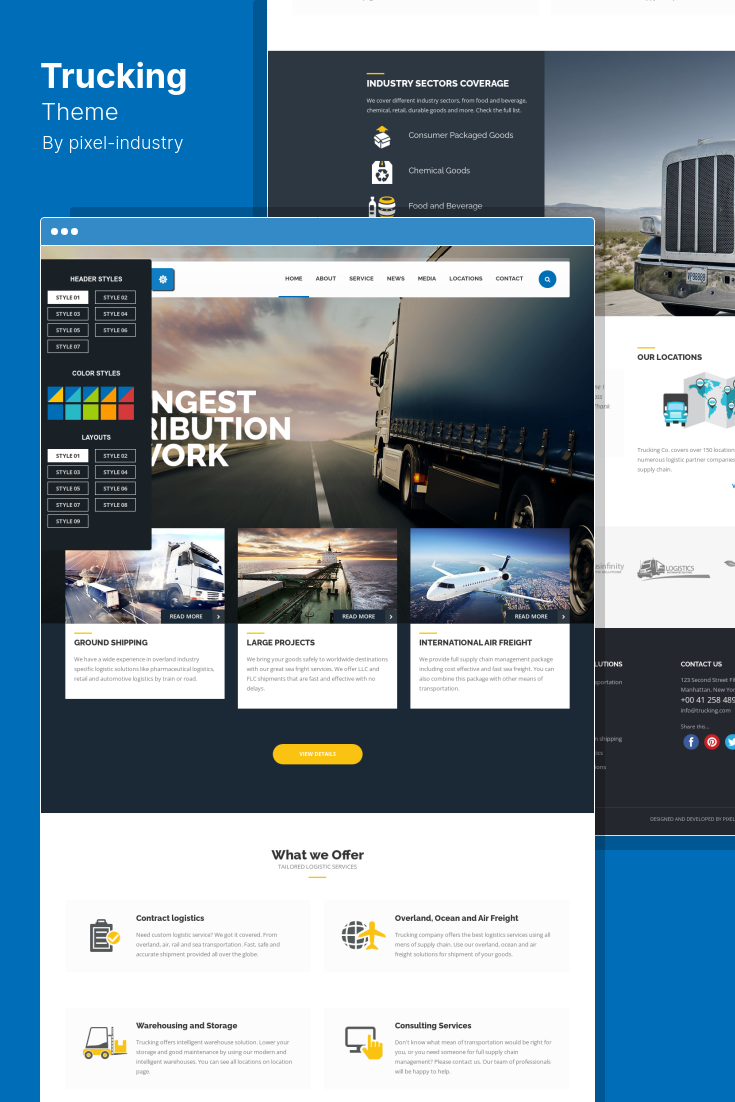 Global Logistics offre un design aziendale di alta classe con un aspetto moderno e intelligente, che lo rende un tema ideale per agenzie di autotrasporti, società di logistica, magazzini logistici e società di trasporto.