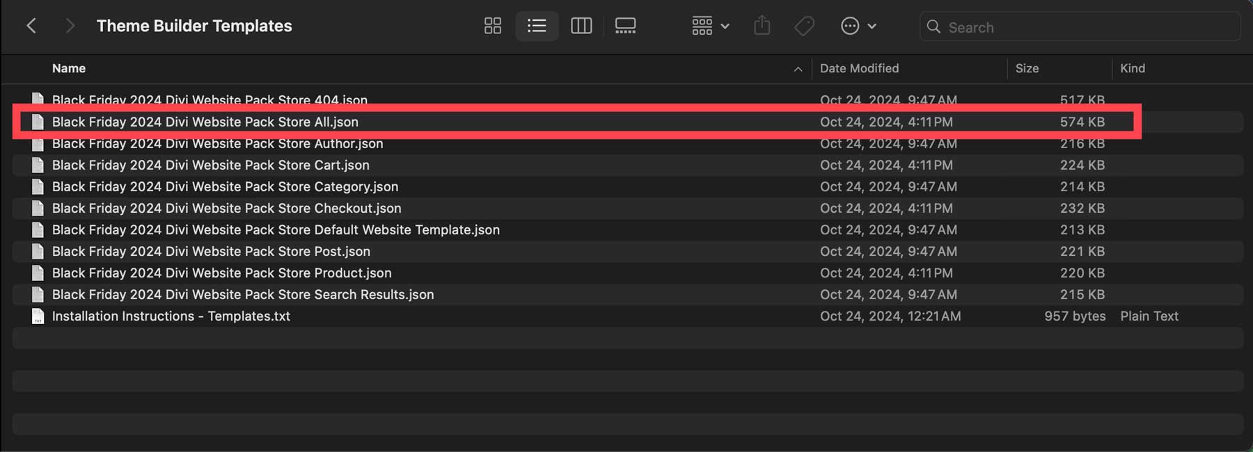 Uno dei file all'interno di ciascuna cartella chiamato Black Friday 2024 Divi Website Pack Store All.json può essere utilizzato per importare contemporaneamente l'intero pacchetto di layout di pagina e il pacchetto di creazione temi (tutti i modelli) sul tuo sito.