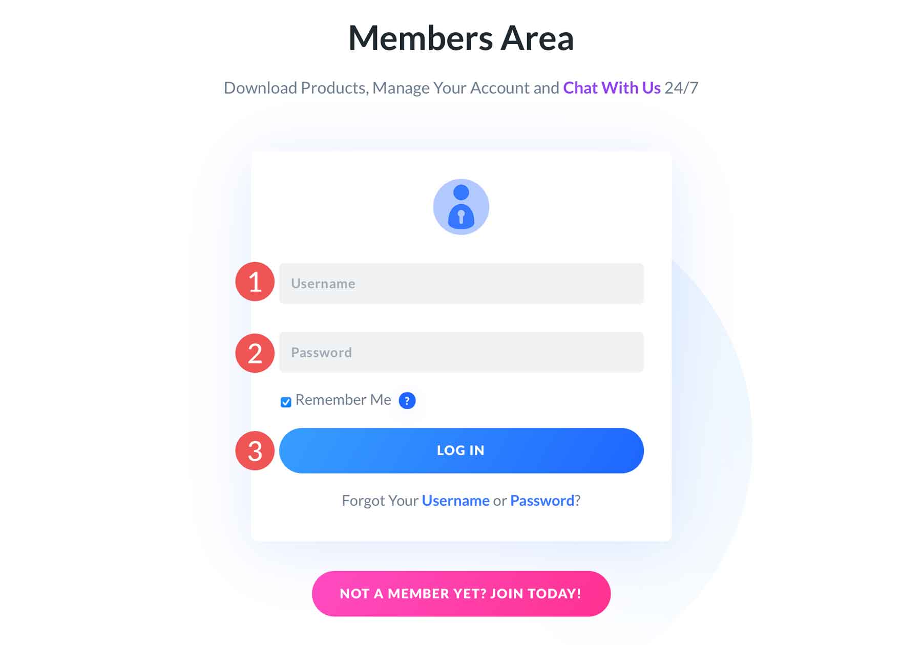 Allo stesso modo, anche tutti gli attuali membri Divi possono scaricare i pacchetti del sito web. Questi omaggi possono essere trovati nella tua area membri. Per accedere ai download, devi prima accedere all'area membri con il nome utente e la password creati quando ti sei registrato come membro.