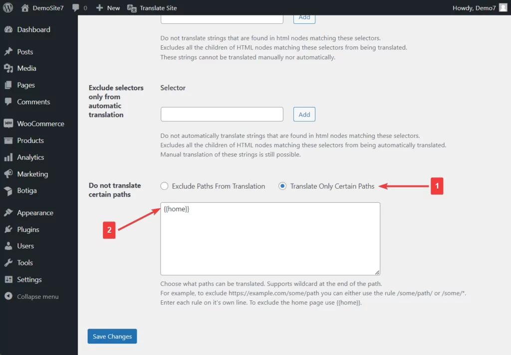 Vai su Impostazioni → TraduciPremere → Avanzate → Escludi stringhe → Non tradurre determinati percorsi e seleziona Traduci solo determinati percorsi . Quindi inserisci questo nella casella bianca: {{home}}