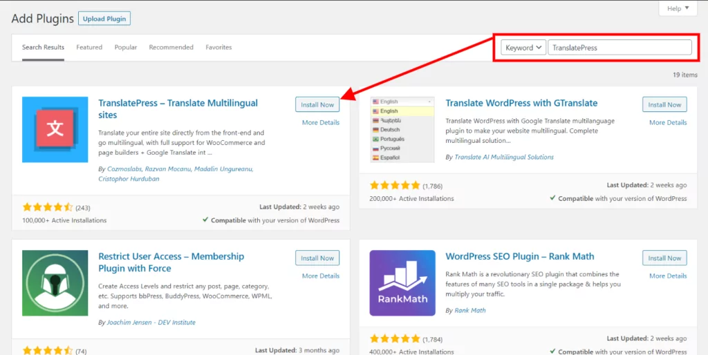 Cerca TranslatePress nella barra di ricerca, identificalo, quindi premi i pulsanti Installa ora e Attiva per attivare il plug-in sul tuo sito web.