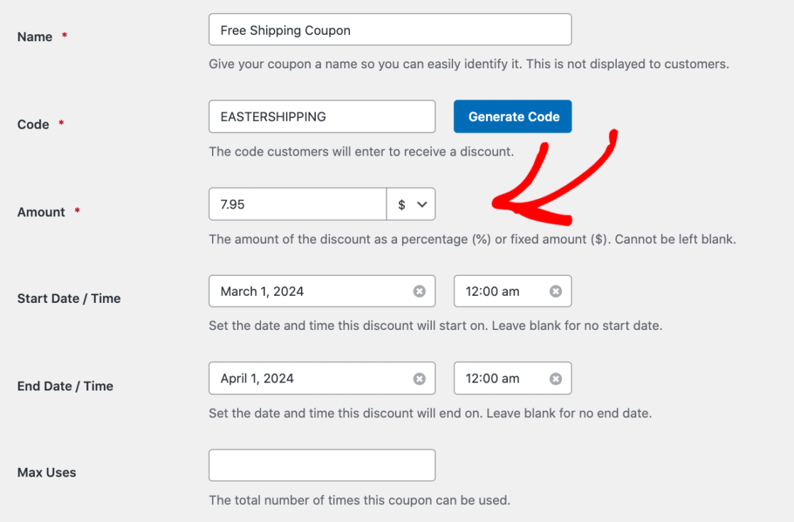 Questo perché i campi Data/ora di inizio , Data/ora di fine e Utilizzi massimi non devono essere compilati ogni volta che crei un coupon: creano semplicemente determinati parametri per lo sconto che stai offrendo.
