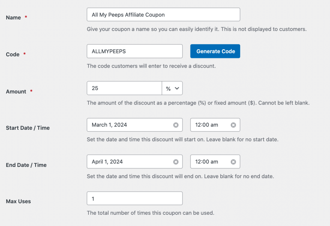 Naturalmente, quando crei i tuoi coupon, l'importo dello sconto, le date di inizio e fine e gli utilizzi massimi sono personalizzabili per essere utilizzati come preferisci!